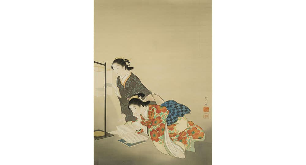 前回から作品のラインアップをさらに充実させた本展では、福田美術館が所蔵する松園の作品すべてを展示。さらに、美⼈画の名⼿として松園と並び称された早世の画家・池⽥蕉園(1886〜1917)の幻の作品《もの詣で》を114年ぶりに公開する。