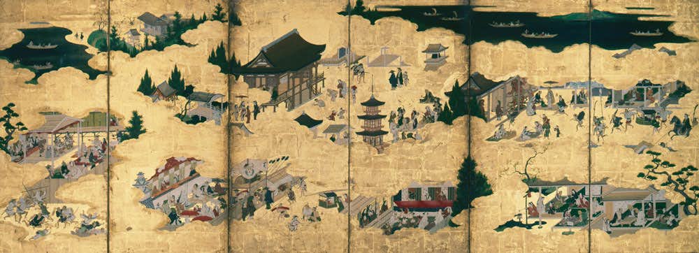 出品作は、江戸や京都など流行・文化の発信地であった都市の様子を描いた名所図屛風や遊楽図、反物を熱心に選ぶ女性を描いた葛飾北斎の肉筆画の名品《五美人図》、様々な身分や立場のスタイルを示す「江戸風俗図巻」など。