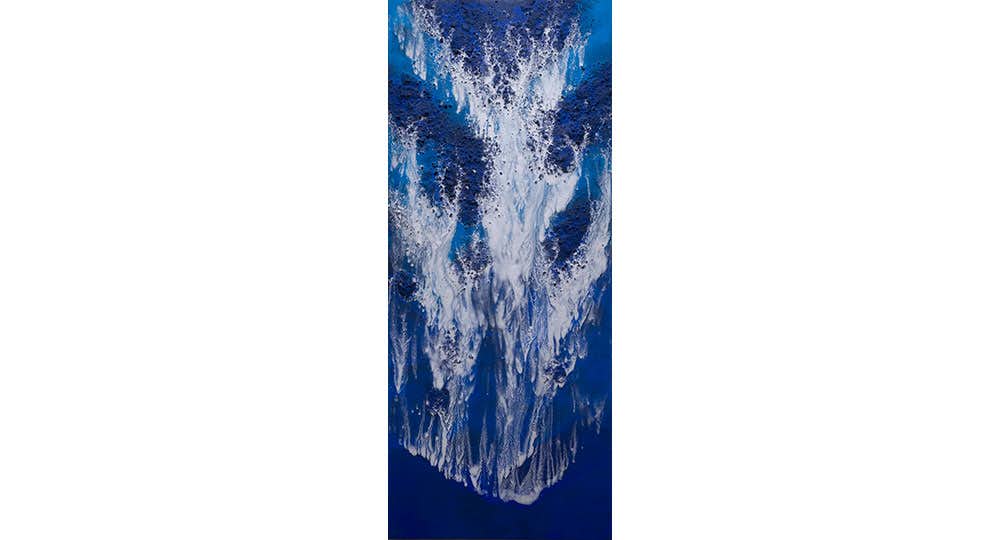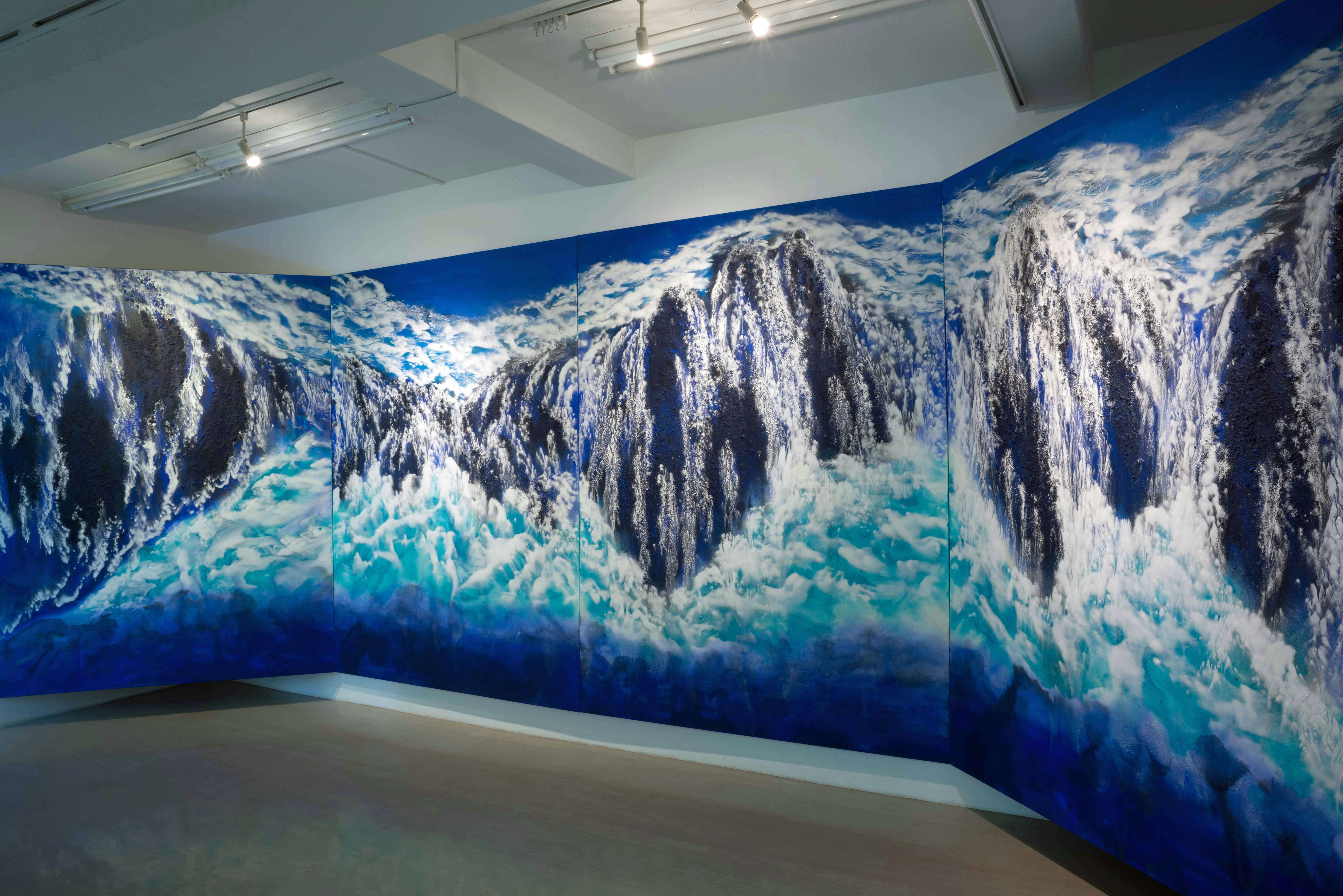 間島が描く「Kinesis(変容・変化・変成)」シリーズは、作品テーマの核となる水とともにに変化を遂げてきた。東日本大震災では水は物質的な脅威となったが、間島は水が流れ変化し続けることは、生と死を育む大地の営みそのものととらえ、「Kinesis」の訳語を「天地無常」とした。そして近年の個展「Earth Diving」以降、作家は「地球に身を投じることで、山水のいまを表現できれば」と考えている。