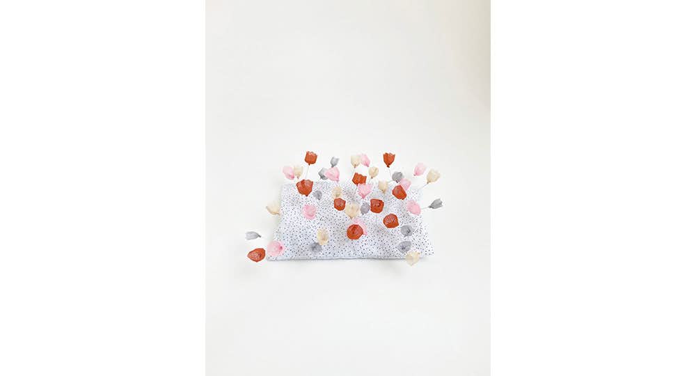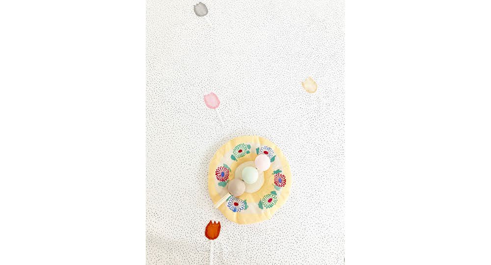 「頭の中で描いた風景画の中に入りたい」という思いから、独自の空間をつくり上げる渡邉。日常のささやかな出来事にまなざしを向け、主に身近な布や糸を用いてその世界を生み出している。「砂漠のチューリップ」や「homemade rainbow」といった詩的な作品を連ねることで構成されるインスタレーションは、渡邉の大切なものが詰まった宝箱を思わせ、様々な感情やひらめきをユーモアを交えてやさしく語りかける。