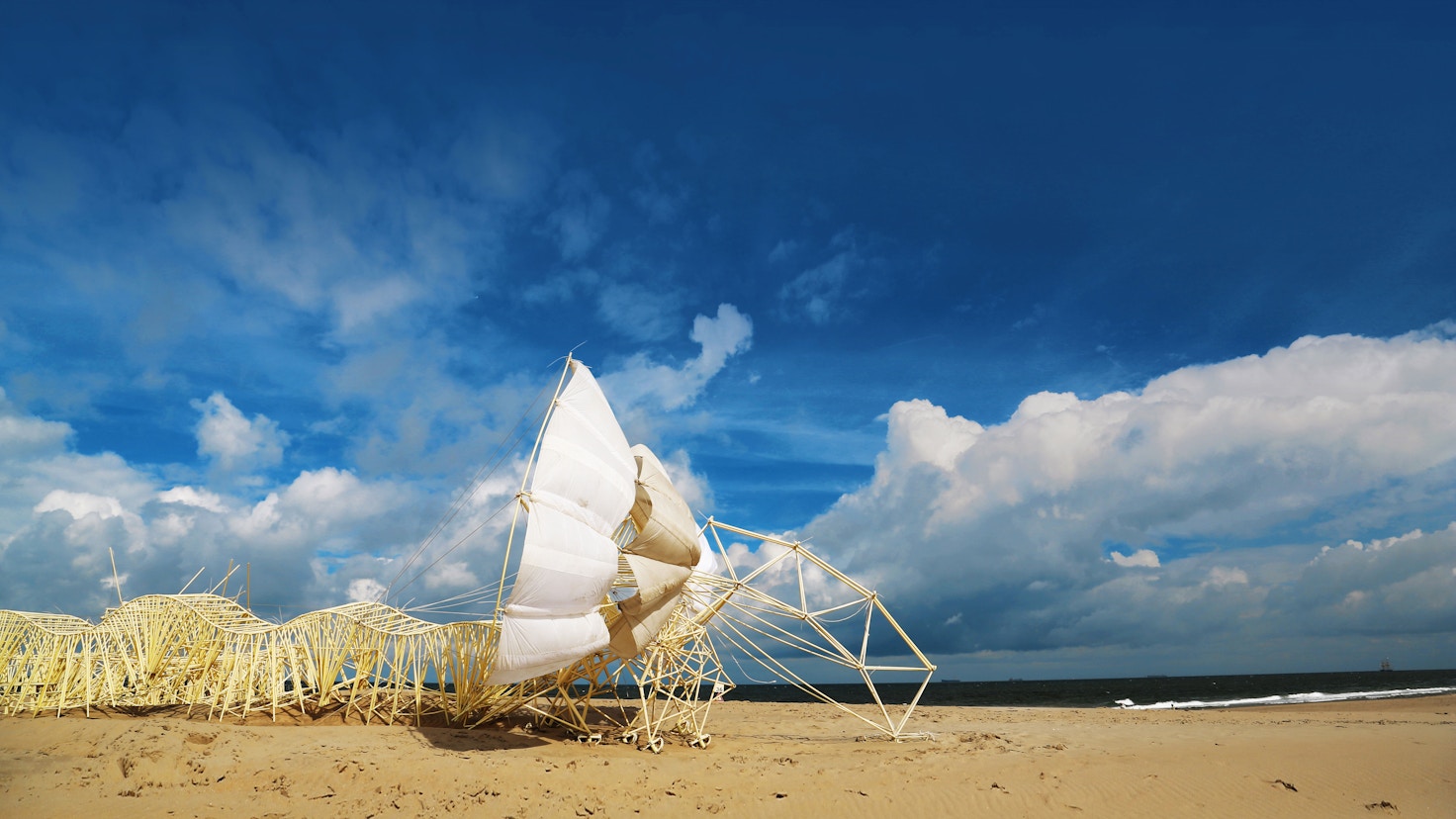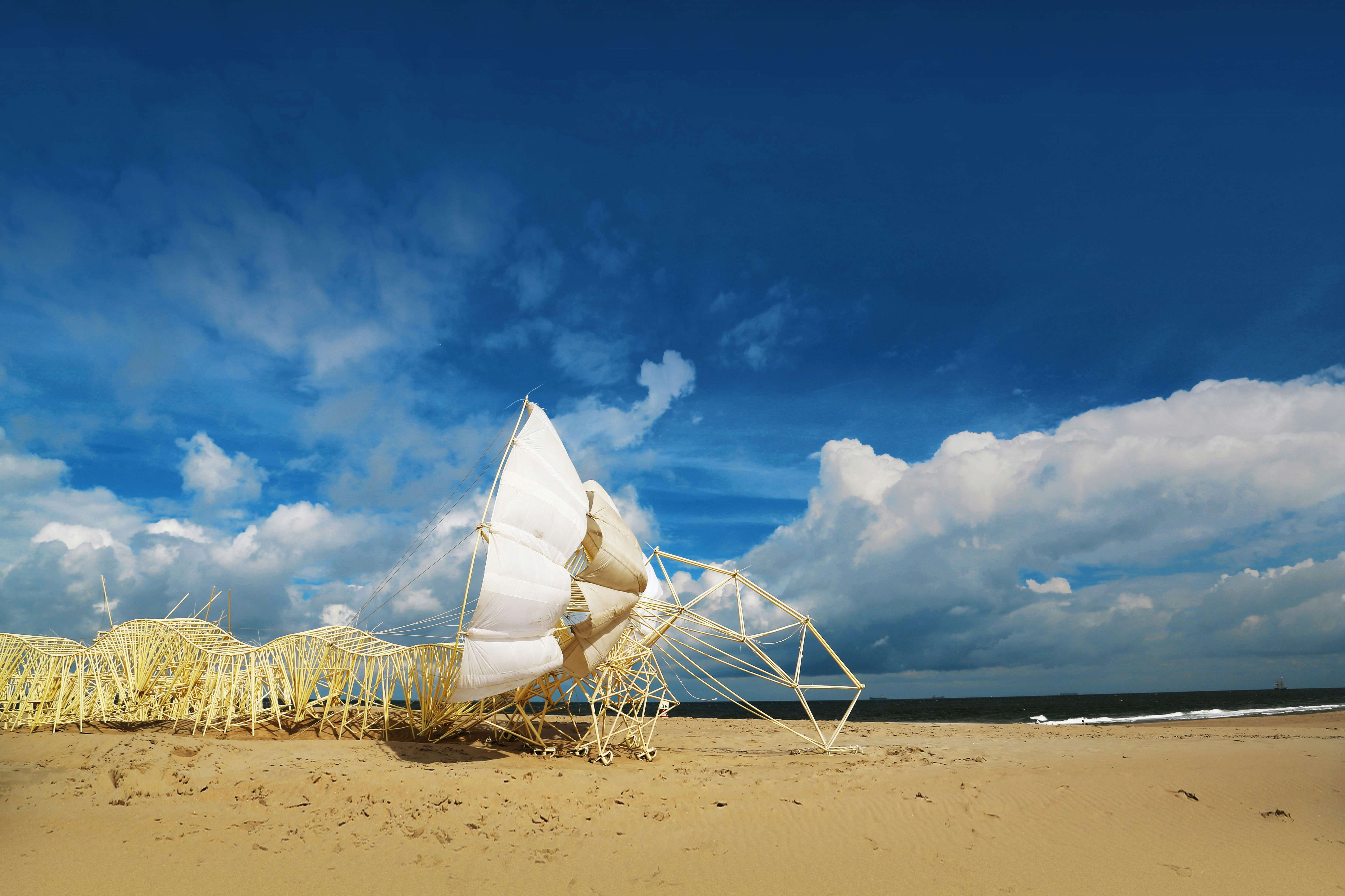 風を動力源としてオランダの砂浜を疾駆する「ストランド(砂浜)ビースト(生命体)」。ボディ全体は黄色いプラスチックチューブで有機的に造形され、物理工学を基盤とした、生き物を思わせるほどに滑らかに動く作品は、オランダのアーティスト、テオ・ヤンセンによって故国の海面上昇問題を解決するために生み出された。
