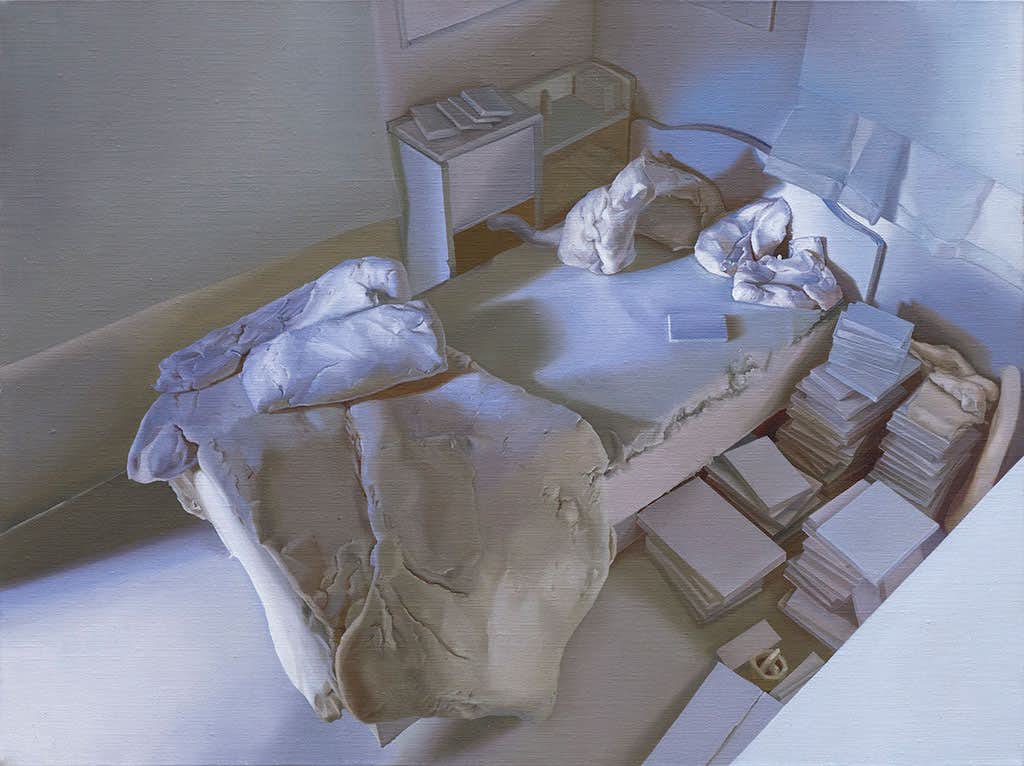 リアルなのにどこか奇妙で不自然な部屋。枕のふくらみやシーツのしわ、重ねられた本たち、コンロに置かれた鍋やフライパン。髙木はこれらを、スチレンボードや紙粘土で自作したミニチュアの部屋や家具をモチーフとして描く。紙粘土の手作業の跡まで丹念に描写され、独特の湿度を持ったその画面は、そこに誰かが直前までいたような奇妙な感覚を見る者にもたらす。