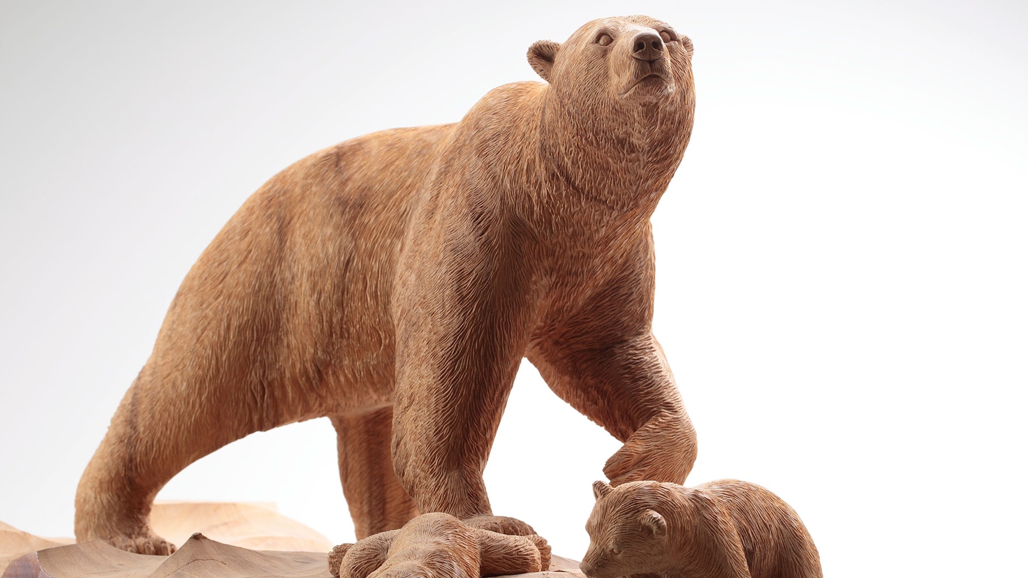 藤戸の作品の特徴は、大胆さと繊細さ、力強さと優しさといった、相反するものが同居していること。デッサンなしで彫り進められた熊や動物の姿は、まるで生きているかのように躍動し、旺盛な生命力を感じさせる。いっぽうで仕上げに行われる毛彫りは細密で、硬い木であることを忘れさせるような柔らかな質感を生み出している。
