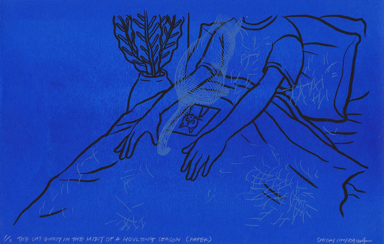「彼らは私たちの預かり知らぬ世界を持ち、おおらかにそこに留まり、過ごし、豊かに生きている。かもしれない。ペットに限らず、人間や、他の生き物に対しても、それぞれの世界の想像をやめずに生きていきたいと願う。今の自分に思いつく可能性を、版画とドローイングで示した(市川詩織)」。