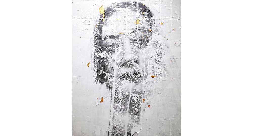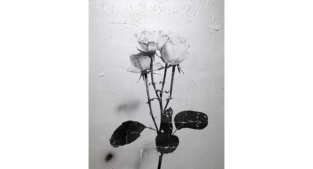 岡田の、モデリングペーストに直接写真を転写しクラックを入れる技法は、出来上がりまでその全貌がわからないという事後性と偶然性を併せ持ち、人と写真との関係性に新しい概念を提起すると同時に身体性、時間性をも獲得している。プリントによるモノトーンの美しいグラデーションや湿度感のあるモデリングペーストの波打ちが重厚感を、クラックで荒れた表面が「軽さ」と「視線の揺らぎ」を生み出し、作品に自在な奥行きを与える。
