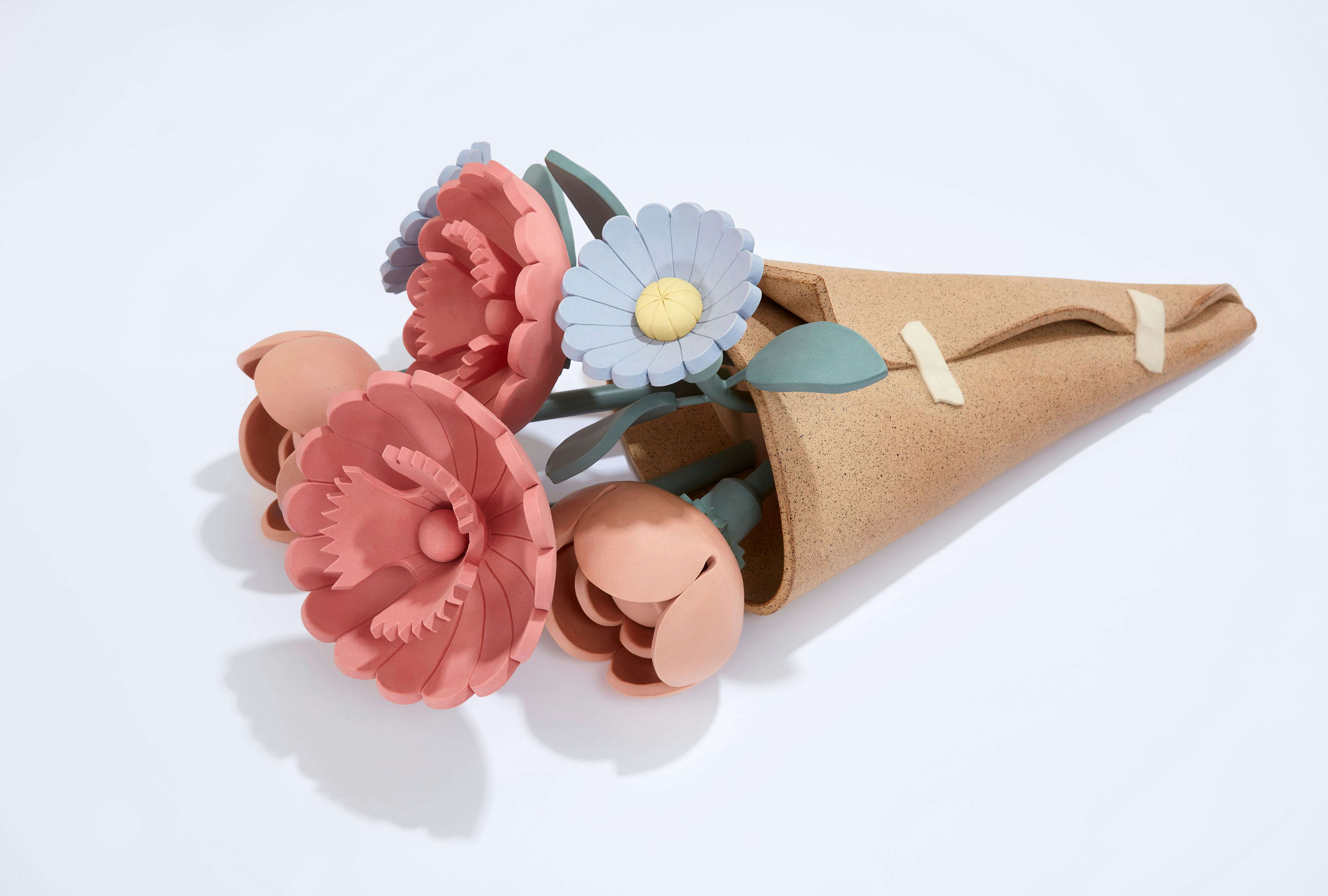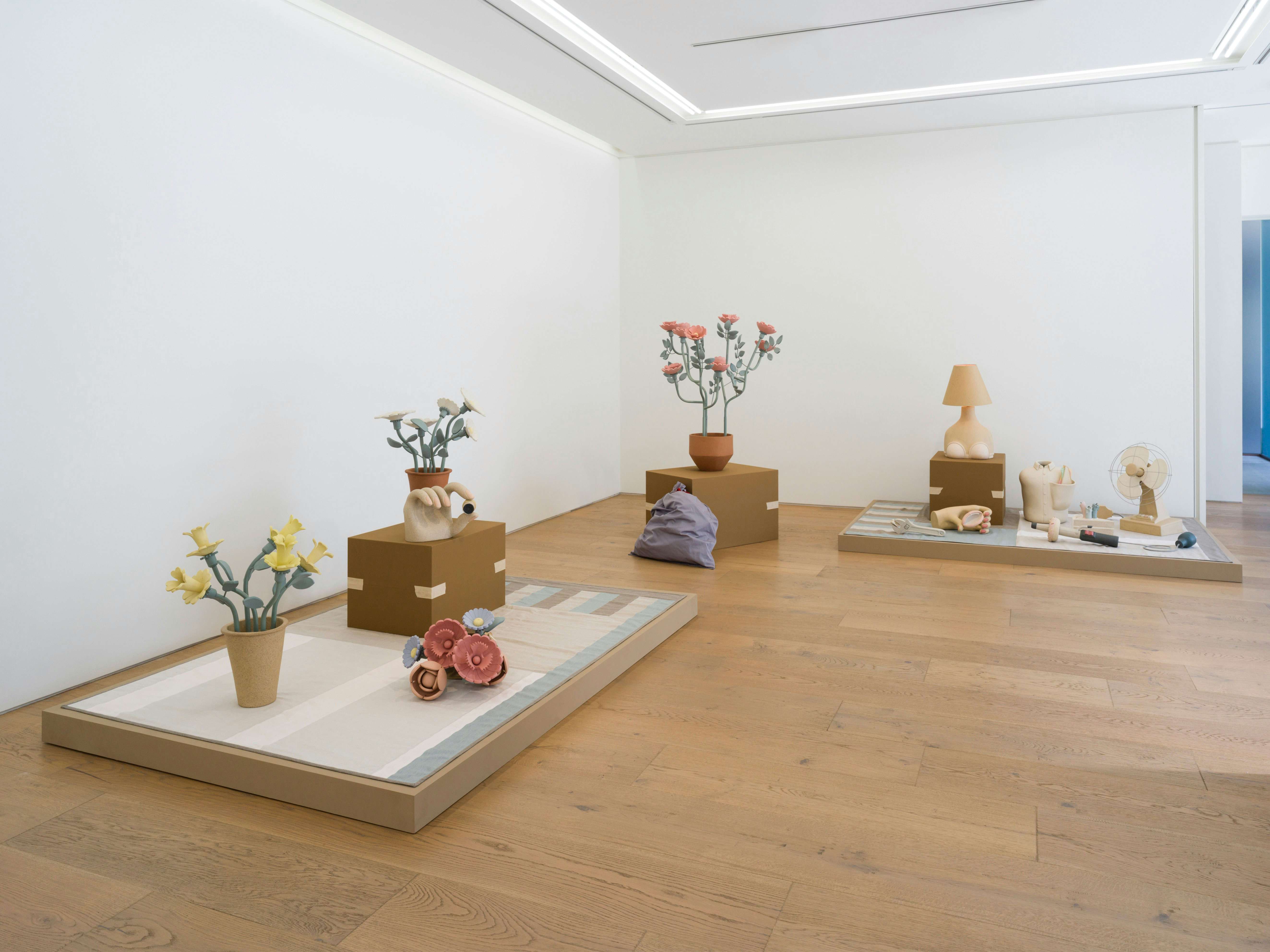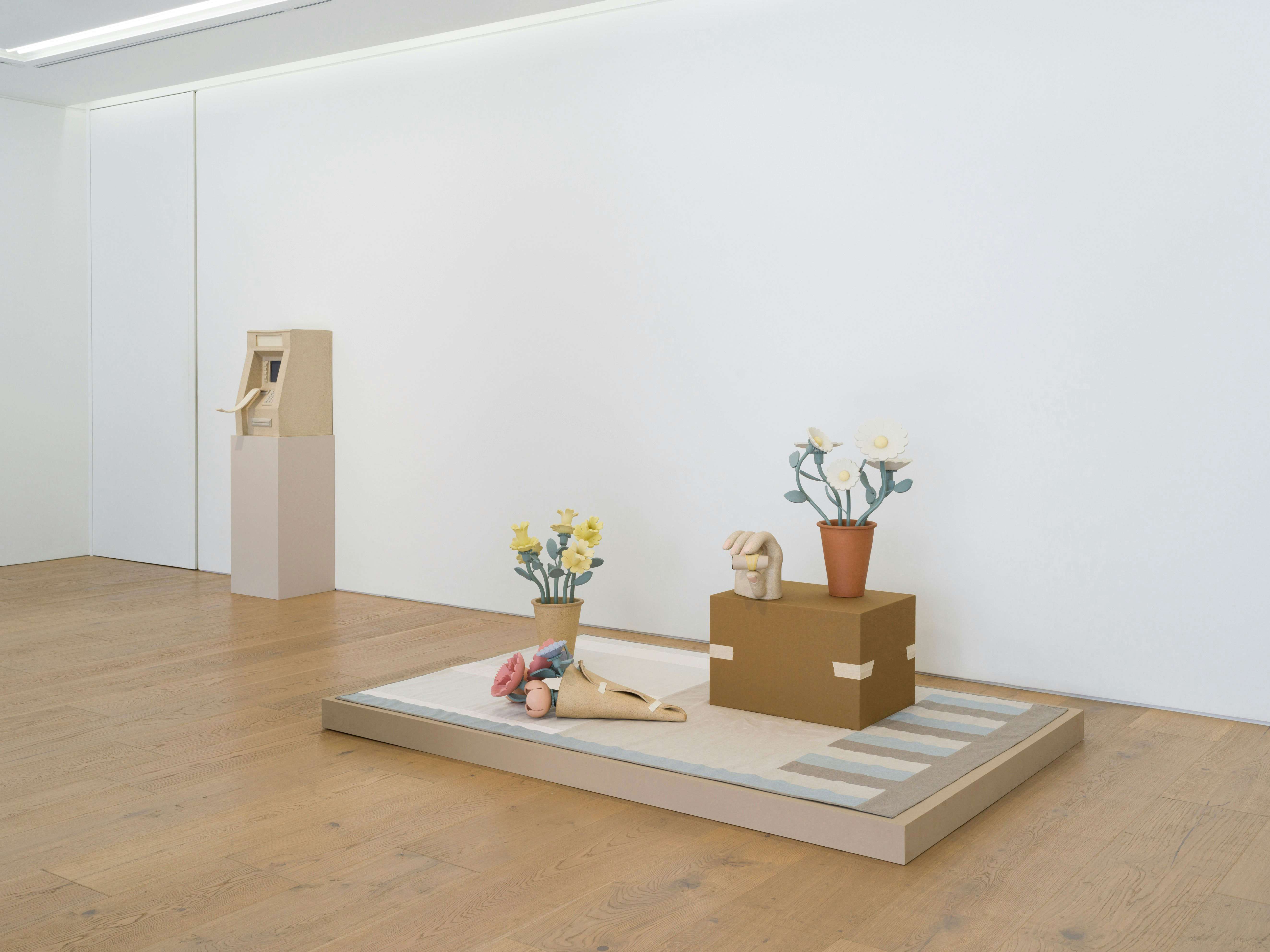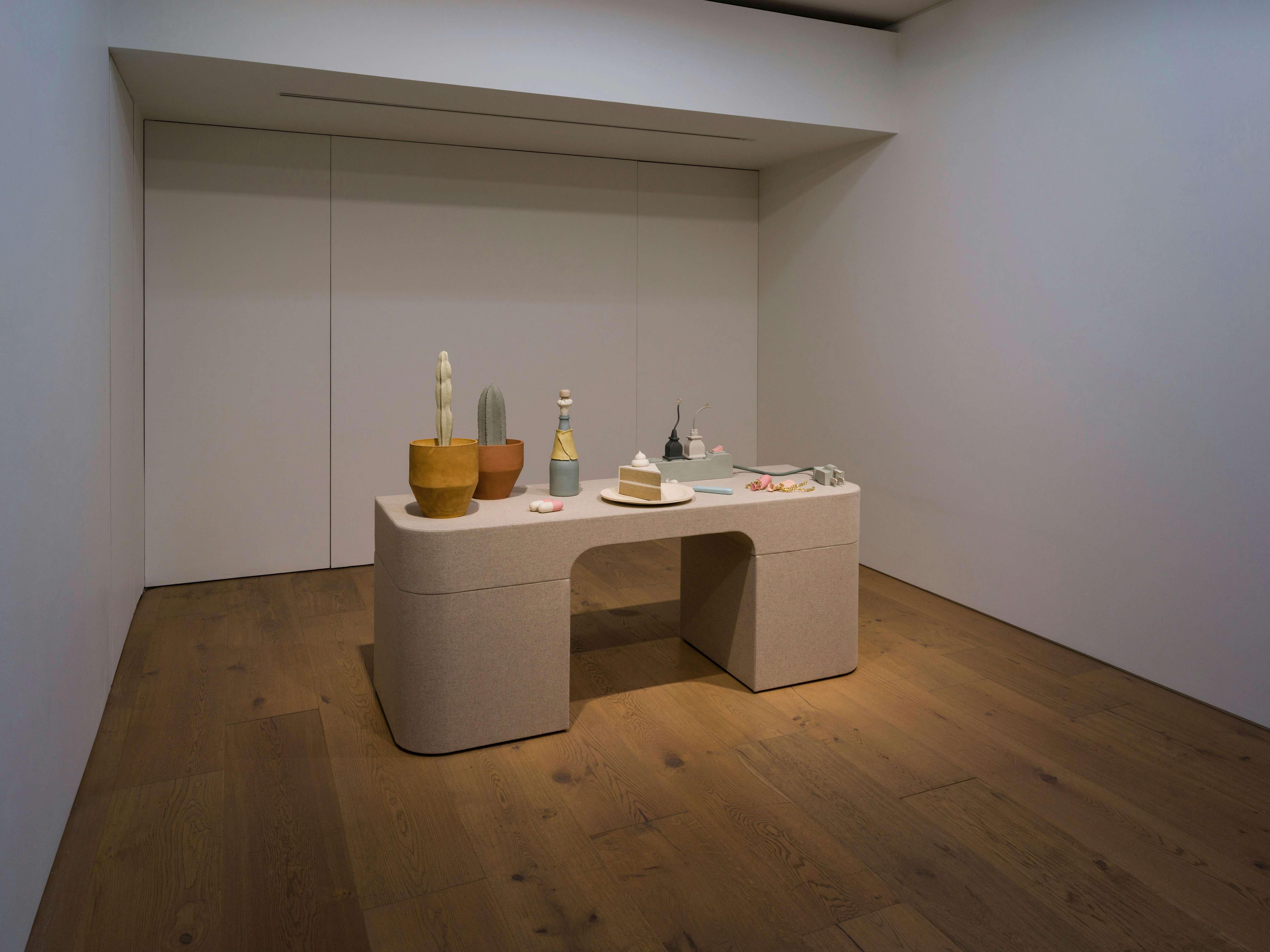 会場に一歩足を踏み入れると、ストリートマーケット、つぶれた花屋、収集待ちのゴミなど、都市生活からインスピレーションを得た複数の作品によって構成されたシーンが展開される。次の展示室には一台のデスクが置かれ、職場の送別会を示唆するようなこれらの場面を通して、ベランジャーはオブジェクト一つひとつのあいだにある精神的な関係性をあらわにする空間を描く。
