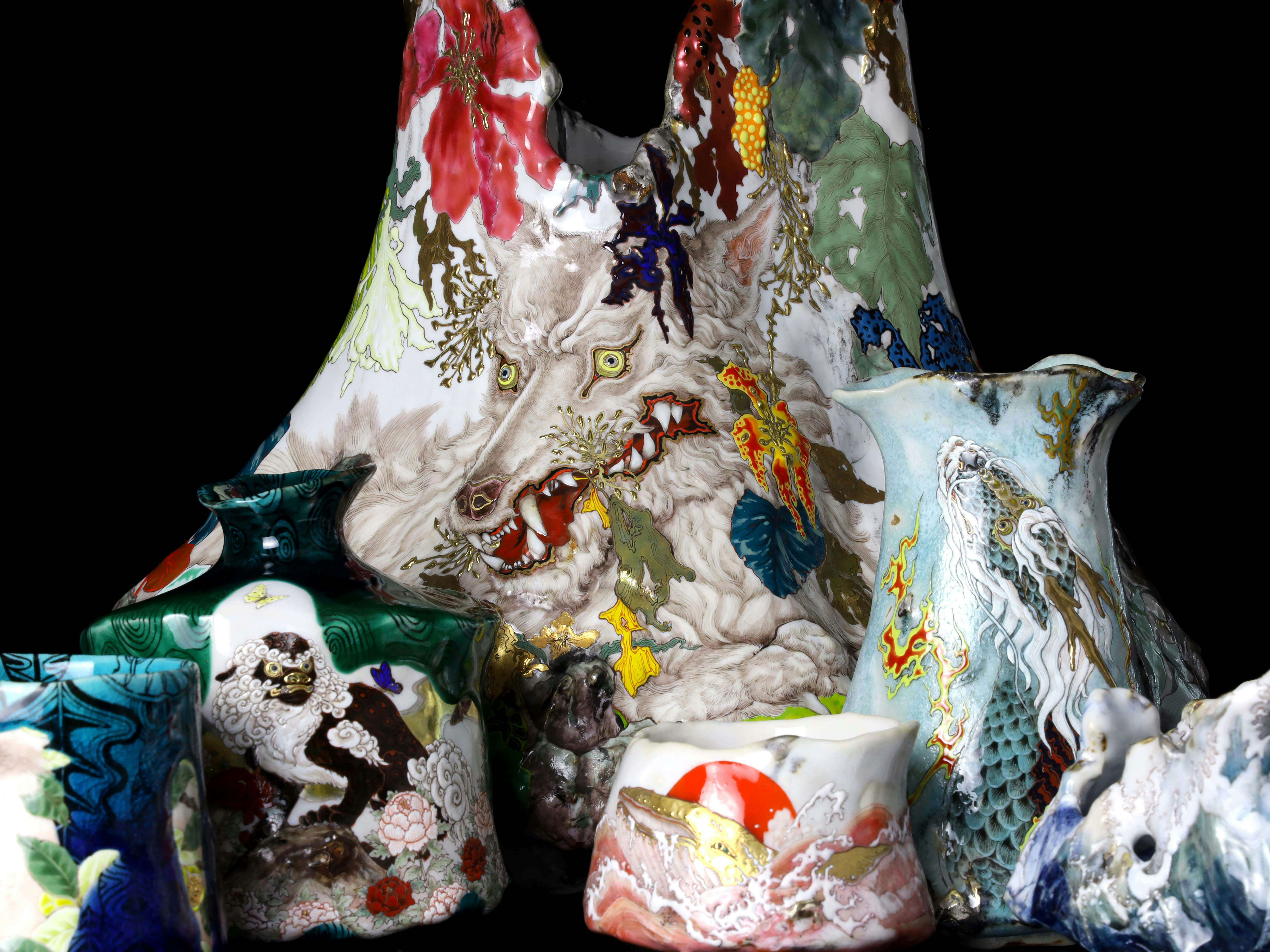 本展では、覚めるような鮮やかな⾊絵がちりばめられた絢爛豪華、⽣の躍動に満ちあふれた九⾕焼のシリーズ「美の器」の新作をはじめ、2021年以降に制作を始めたファブリックとセラミックを組み合わせた作品シリーズも並ぶ。