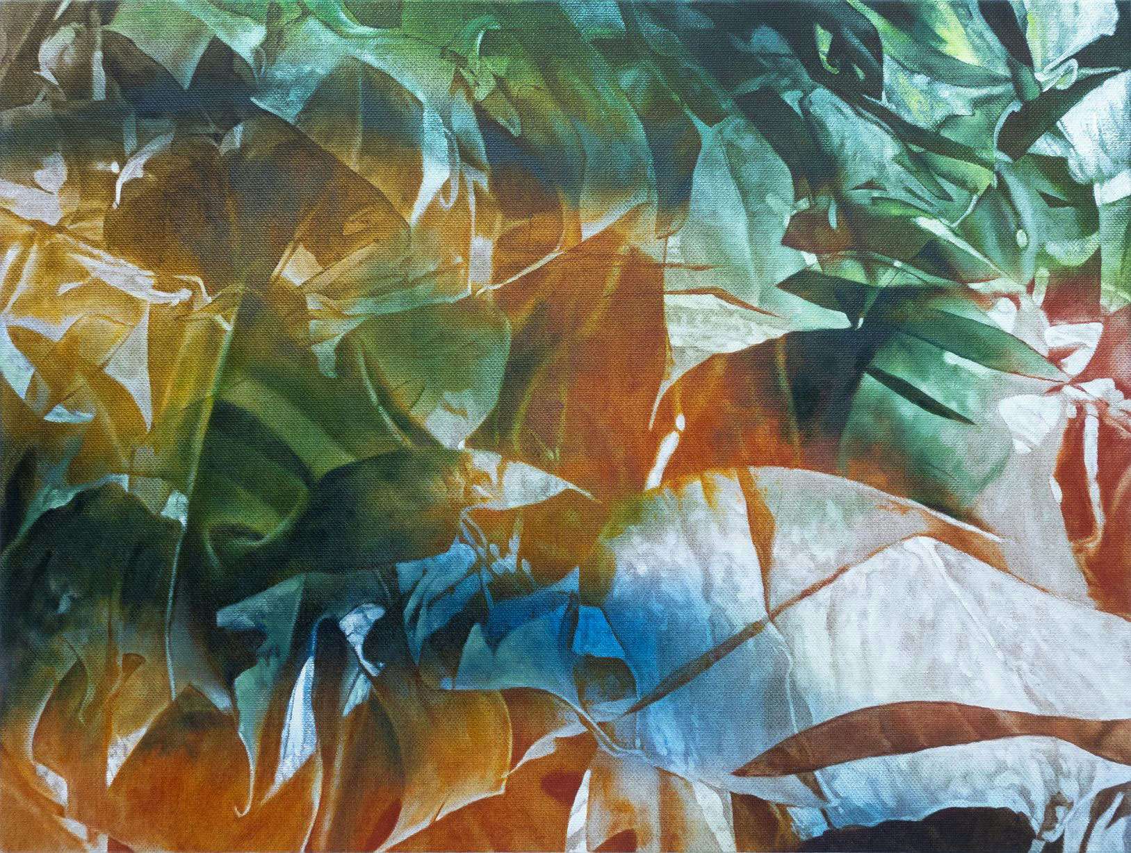 郷治は油画の素材としての透明性に着⽬し、伝統的な光と影の表現やパースペクティブ(視座、遠近感)への関⼼をさらに推し進めて、画家の「⾒て描く」という⾏為の可能性を追求している。⼀貫して描き続けている熱帯植物のモンステラは、南国を想起させるクリシェ(常とう句)であり、同時に本来は鬱そうとした熱帯⾬林に⽣息する遠い存在でもある。そうした単⼀のイメージとして消費できない意味のズレや⼆重性、画⾯に充満して描かれることによる対象との距離感やパースペクティブの揺らぎといった、表象としてのイメージにまつわる様々な現象を郷治は表現に落とし込み、新たなイメージを生み出している。