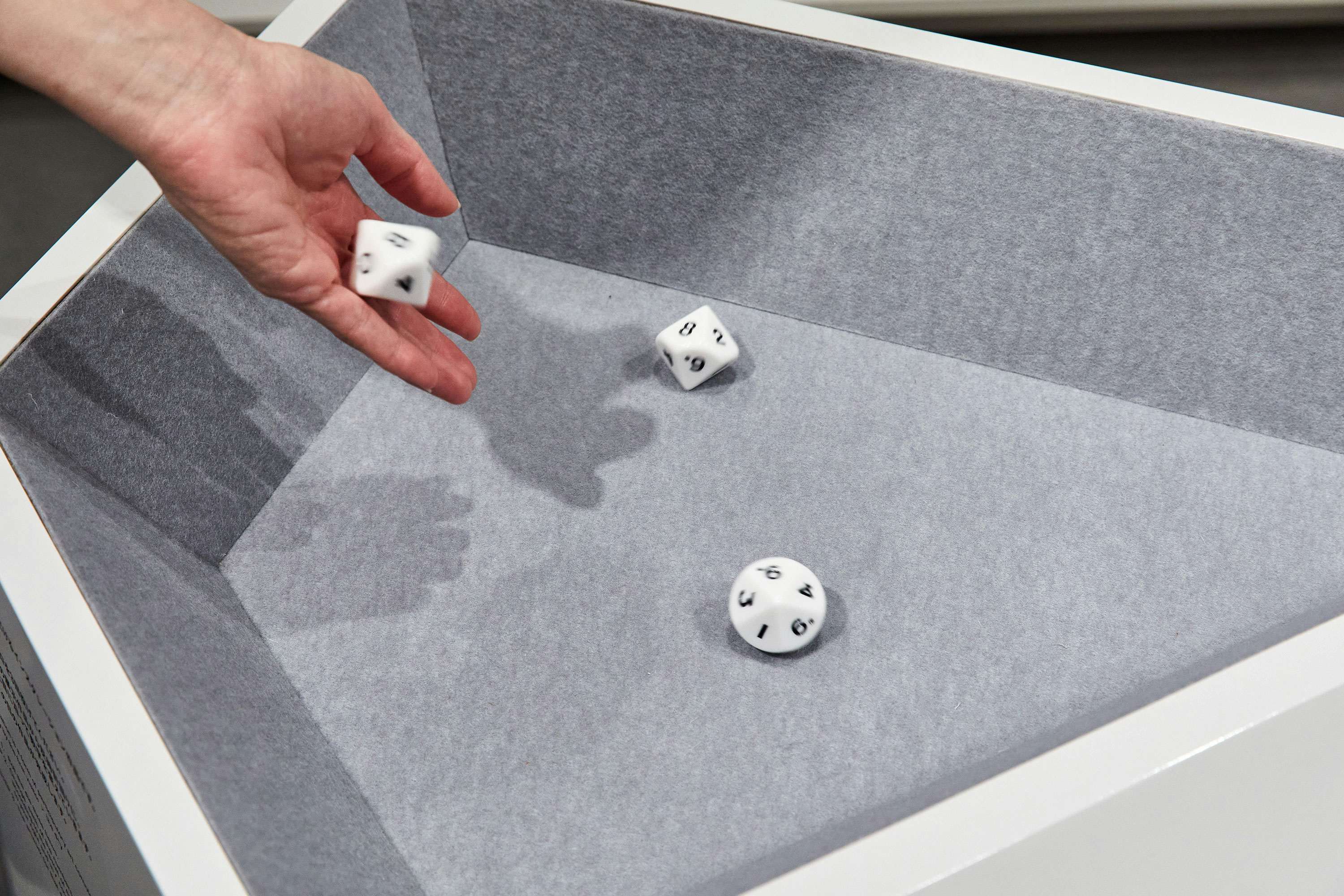 本展は、デジタル数字をモチーフにした作品で知られる現代美術家・宮島達男とのコラボレーション。その日の来場者にサイコロを投げてもらい、その日の展示を決めるというアナログな手法を取り入れ「時間」を表現する。