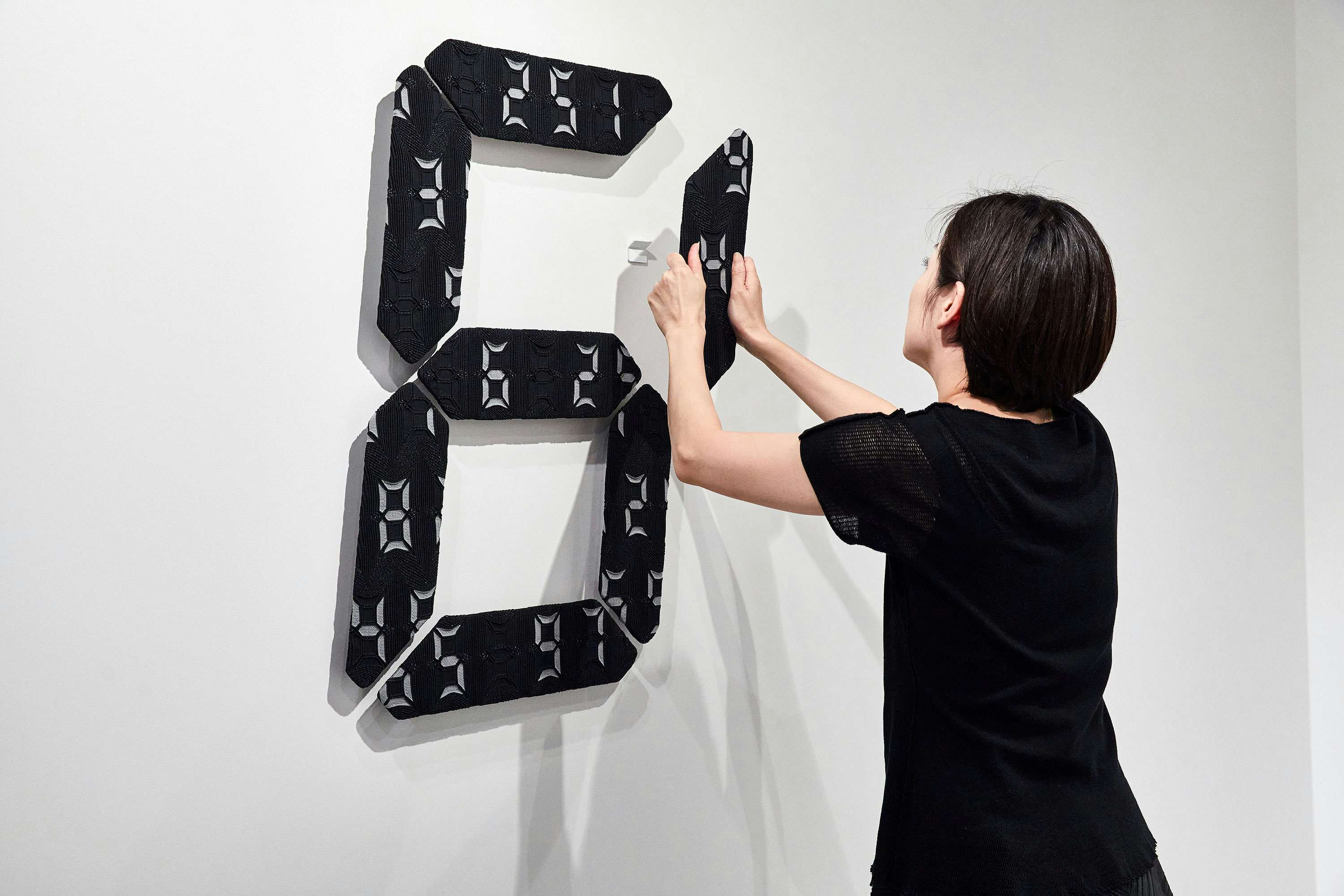 毎日、ひとりの来場者に10面体のサイコロを振ってもらい、出た目に従って壁にパーツを掛けると、「時間」を暗示する数字になり、その日の作品が完成する。つくり手と受け手のコミュニケーションによって服の新たな可能性を追求する「A-POC ABLE ISSEY MIYAKE」と、宮島による、本展でしか見ることのできないパフォーマティブな作品を楽しんでほしい。