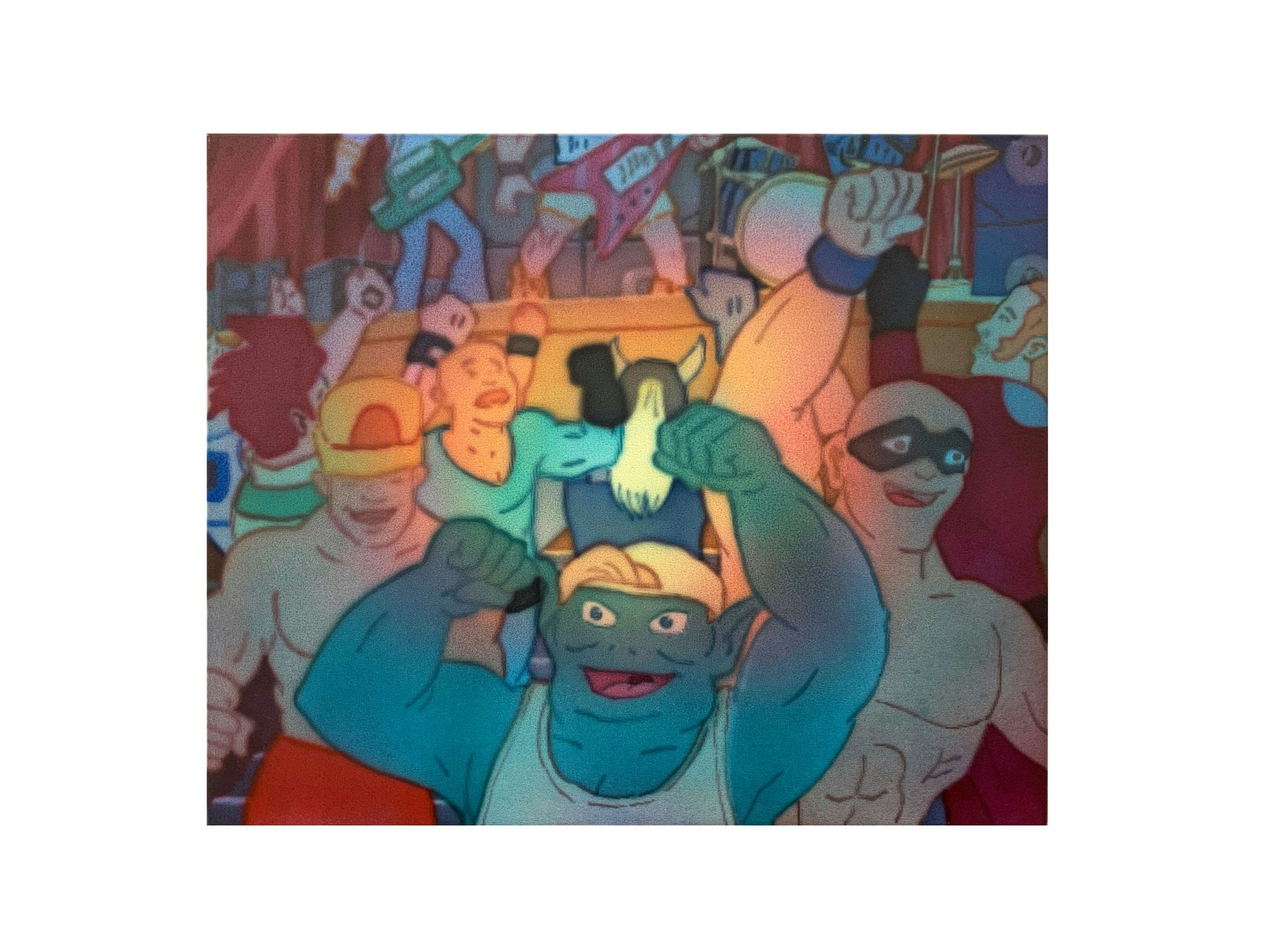 作品のモチーフとなるのはインターネットから抽出した昔のアニメの1シーンなど。それを個人的な意識の外の出来事として距離感を持って描くで、岡野は物質としての画面/絵を探求している。