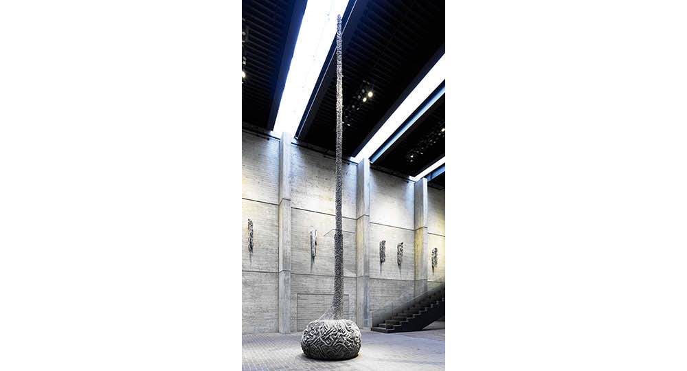 森の根を思わせる幅3×高さ4メートルの《水根Ⅱ(スワ)》、無数の視線の集積によってつくり出される《視線体-散》など、森をさまよい、その根源におりていくように、戸谷の豊穣な作品世界を体感する好機となる。