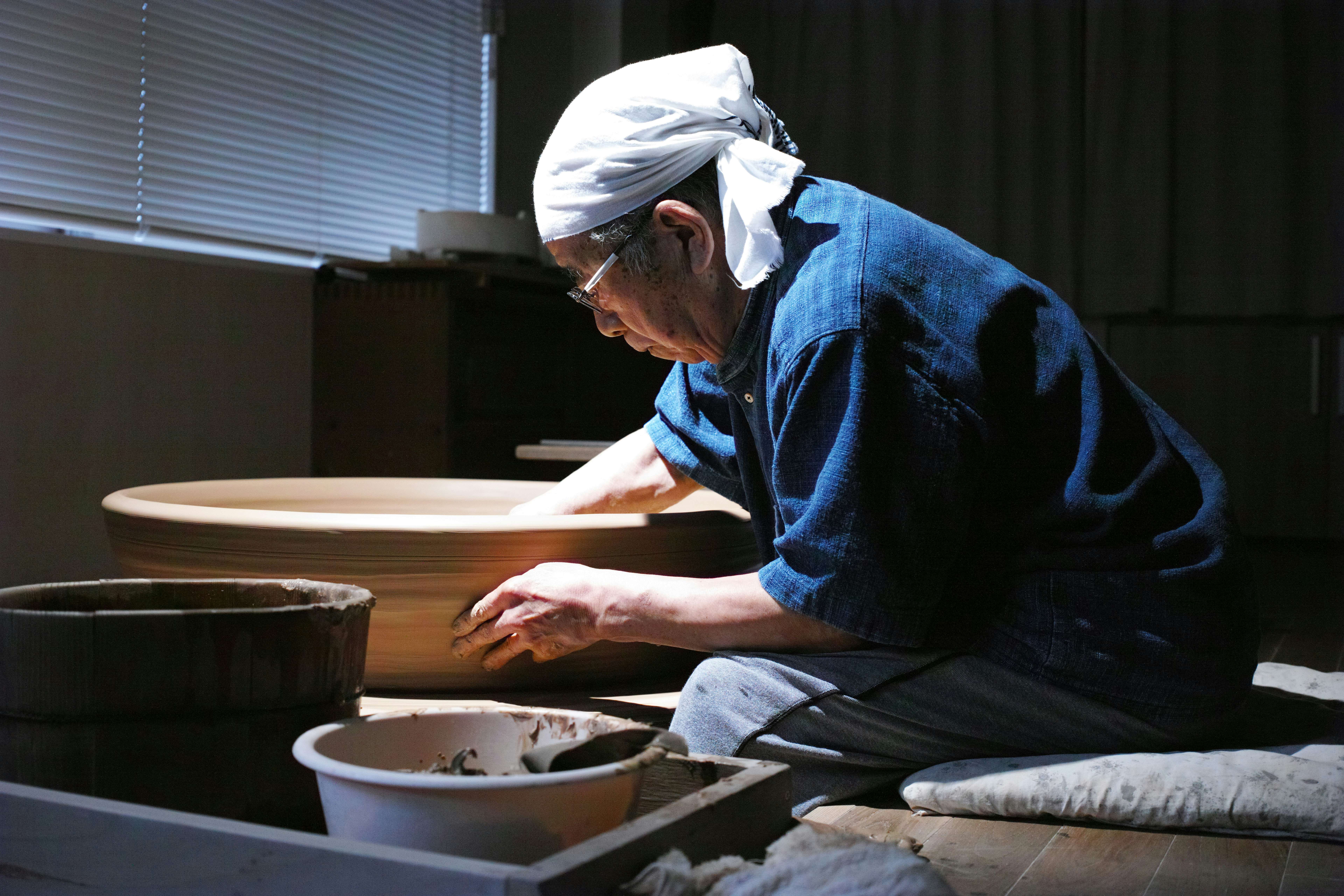 竹原の窯と在住地の京都と往復しながら、強度のある東広島市西条の陶土を好みしばしば制作に用いる𫝆井。土という素材の魅力を最大限に引き出しながら、身近にある自然や素材を作品に取り入れた新たな表現へと果敢に挑んでいる。