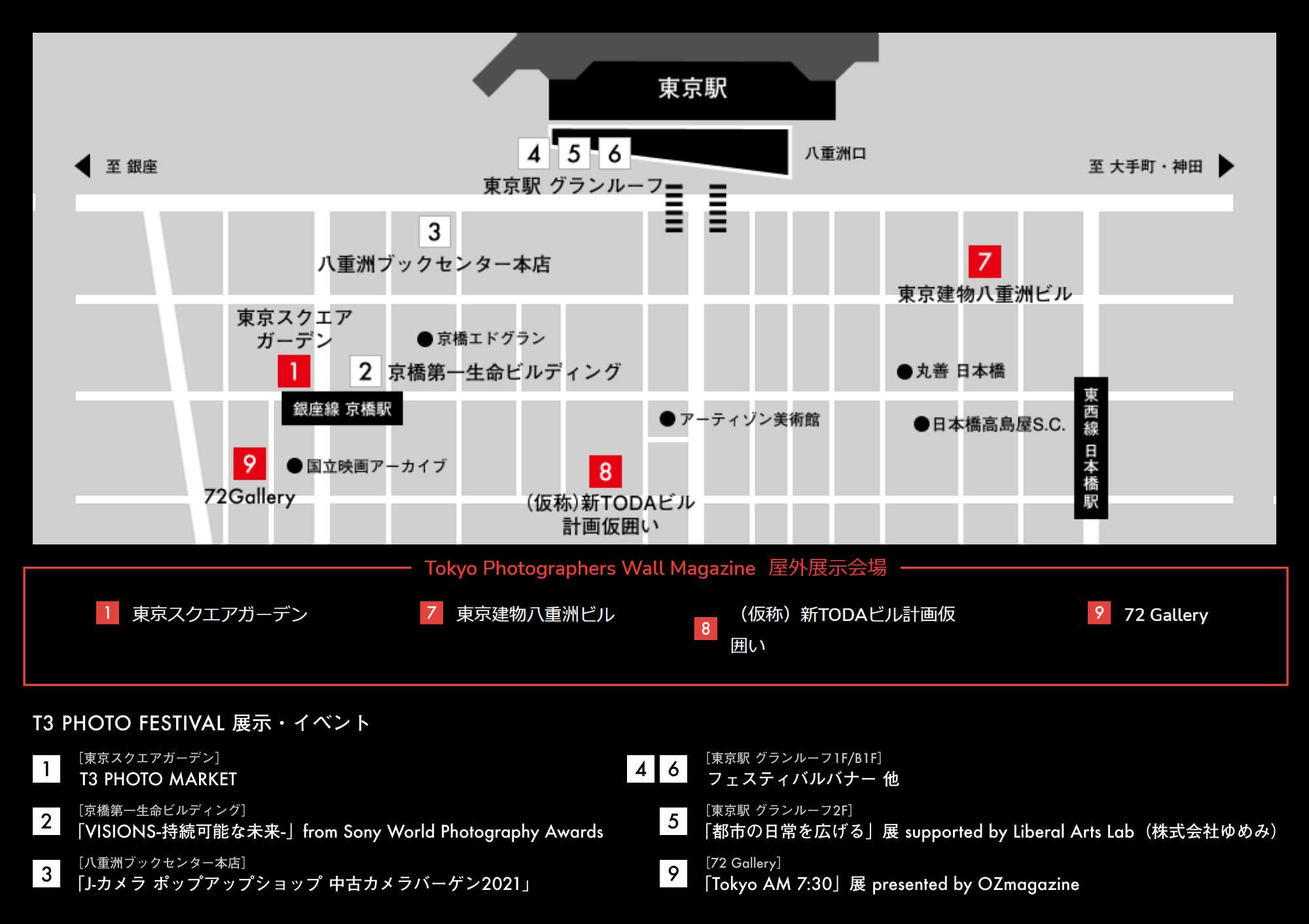 本年は、昨年よりも展示エリアを大きく拡大させ、東京駅八重洲口・グランルーフ、東京スクエアガーデン、(仮称)新TODAビル計画仮囲い、東京建物八重洲ビル、京橋第一生命ビルディング、八重洲ブックセンター本店、72Galleryなど9ヶ所で写真展を開催。来場者は八重洲・日本橋・京橋のエリアを街歩きしながら展示を楽しむことができる(公式ウェブサイトにて会場マップを掲載)。