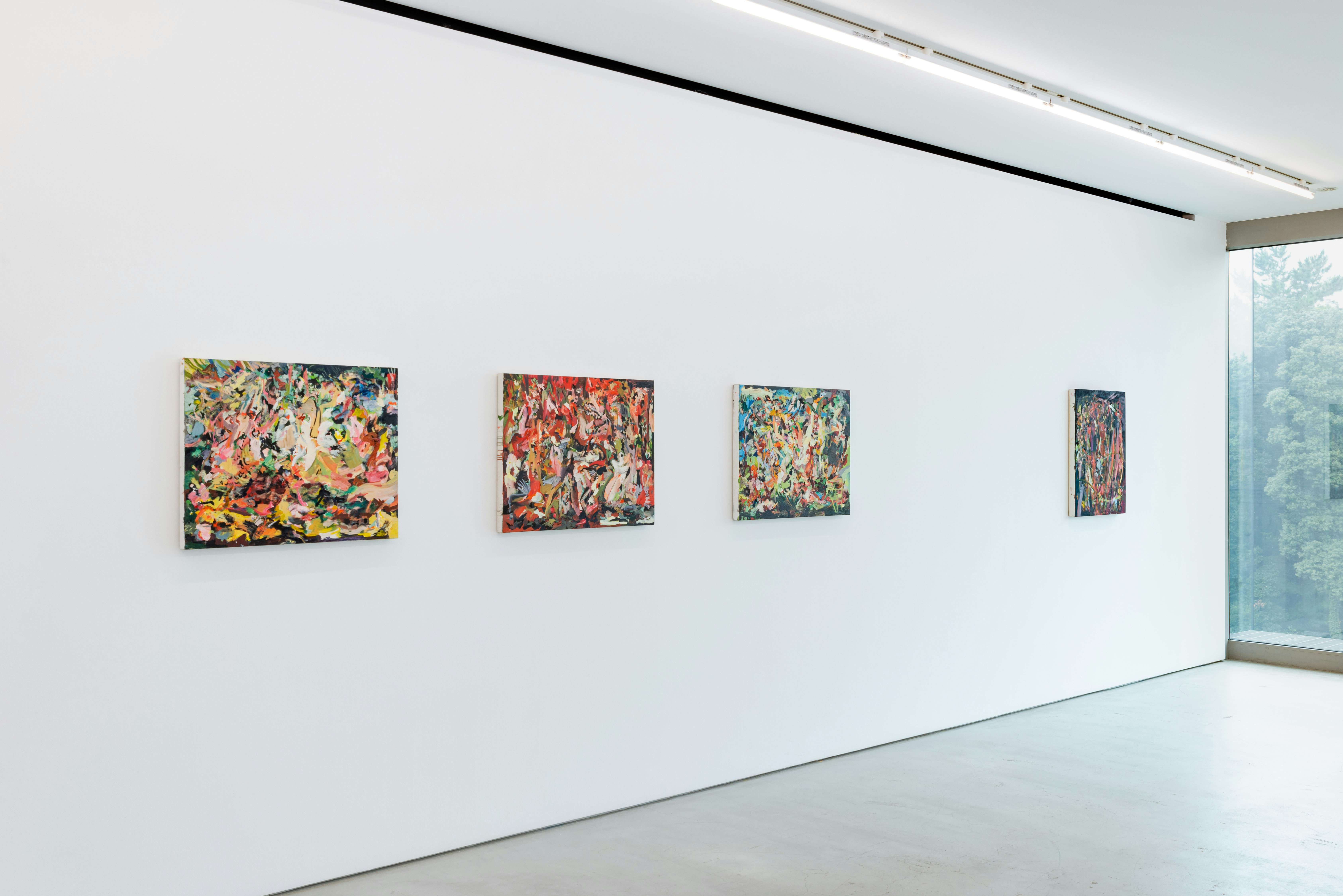 いっぽう、無限の潜在的可能性や、多元性を持つ宇宙としての絵画という近年の新しい取り組みでは、最新技法を⽤い、描きはじめの作品の撮影データを同⼀素材・同サイズのキャンバス上に転写するというプロセスを踏んでいる。同じ原型の由来を持つ作品でもあっても、その描かれ⽅は多種多様だ。⾮常に似通った作品が⽣まれるいっぽうで、⾒かけ上ではまったく異なって⾒える作品もある。