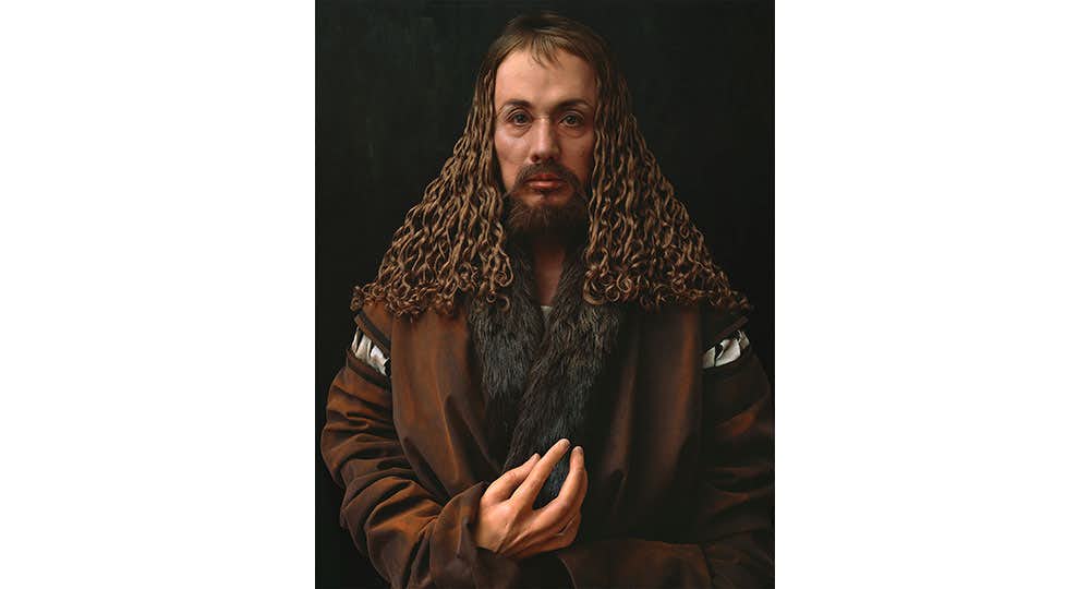 一見して交わるところのない2人のアーティストが本展のキーワードとしたのは、森村が扮した松本竣介の自画像作品だ。《わたしはどこに立っている》と題された本作は、若くして聴力を失いながら画家を志し、戦中の国防美術の流れにも果敢に抗った松本竣介の代表作《立てる像》(1942) が主題となっている。また本展では、森村の自画像の美術史シリーズより、松本竣介に加え、ヤン・ファン・エイク、デューラー、ダヴィンチ、カラヴァッジョ、ゴッホらを取り上げ、三嶋がそれらの人物へ捧げる新作を発表する。