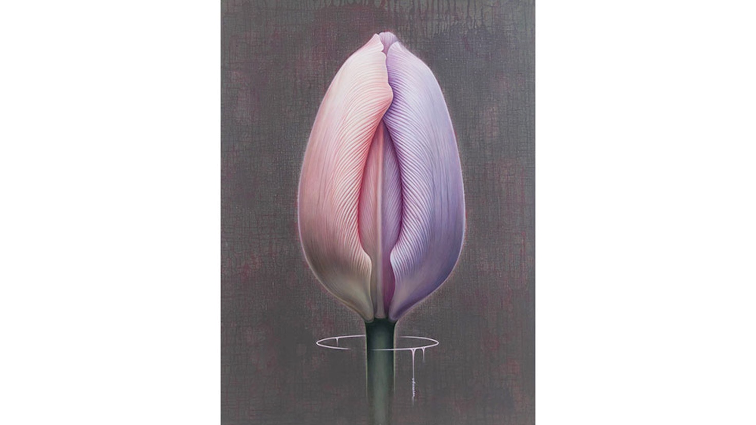 木村は1971年東京都生まれ。現在は千葉県を拠点に首都圏で活動。画面を漆黒の宇宙空間や虚無の空間に見立て、一輪の花をひとつの世界として描いている。近年は、それまで和紙にアクリリックだった技法をキャンバスに油彩へと移行し、さらに奥行きのある世界観へ変容することを試みている。
