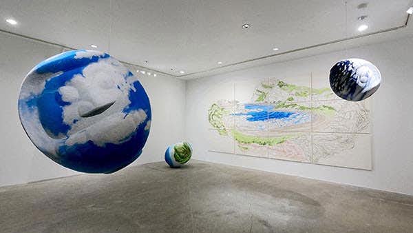 また、展示室には2016年に制作された《だるまさんが転んだ、そして地球になった》も展開。康が、目の前に広がる風景は球体の表面にあるという、宇宙からのもうひとつの視点とともに風景を再解釈して制作した作品となる。