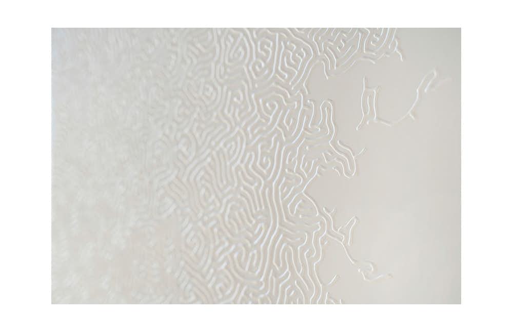 「迷宮」と題した迷路のような文様について、「大切な人との思い出に、今ここに生きる自分がつながっていて欲しいと願いながら、塩や絵具等を用いて描いてきました」と語る山本。また、「一見迷路のように見える文様は、迷わせることを目的として描いているのではなく、迷宮のように一本で思い出につながっていてほしいとの願いを込めながら描く痕跡」であるとしながら、迷宮は自身にとって希望のタイトルだとしている。