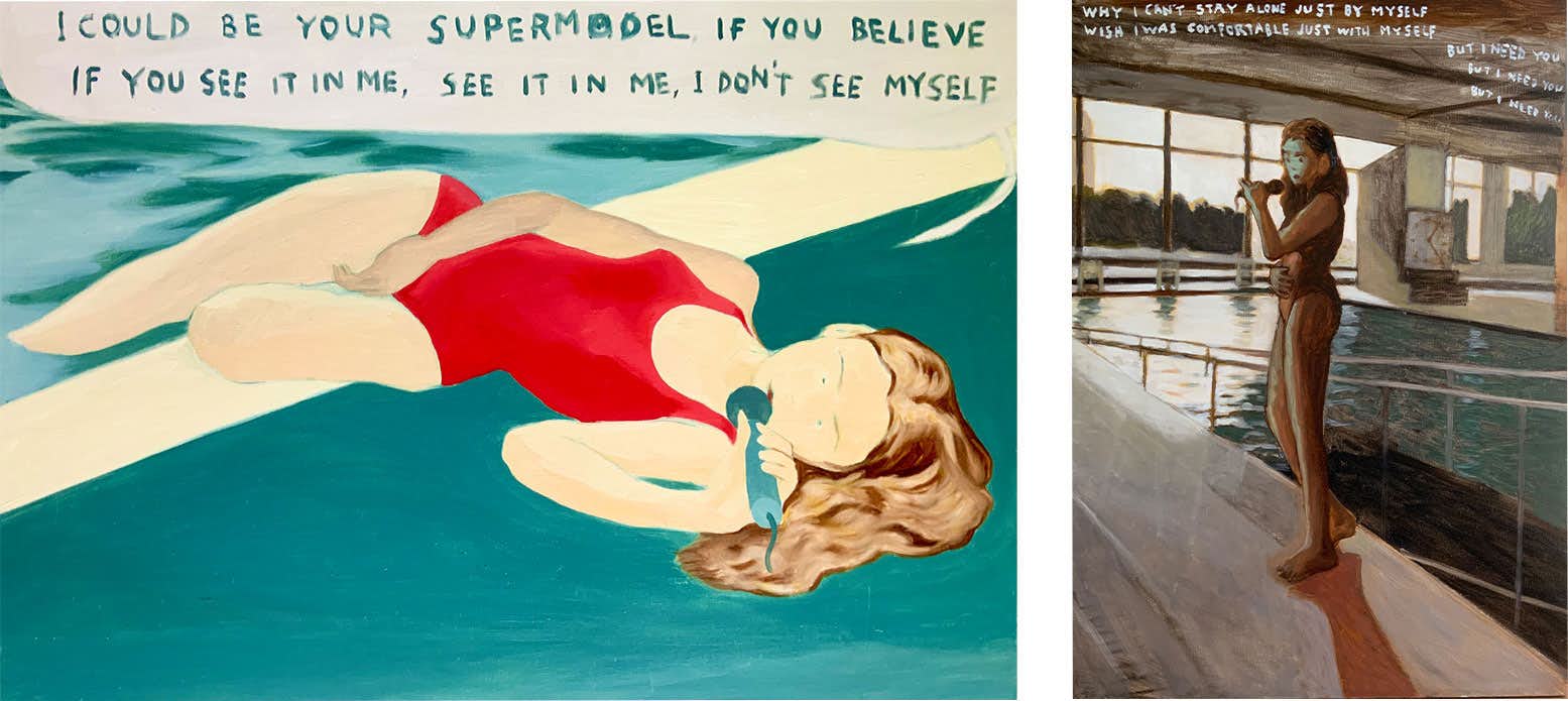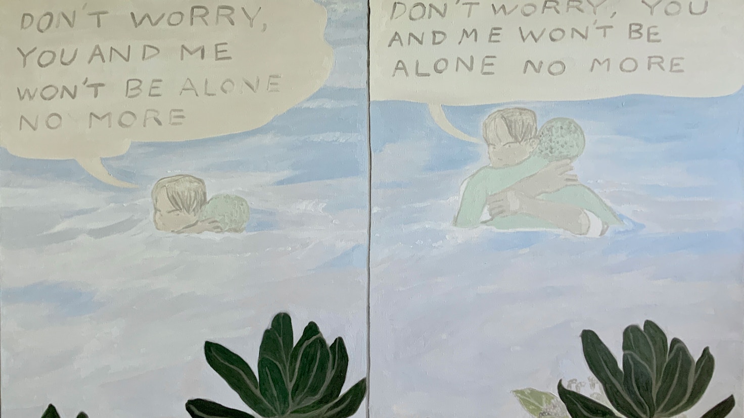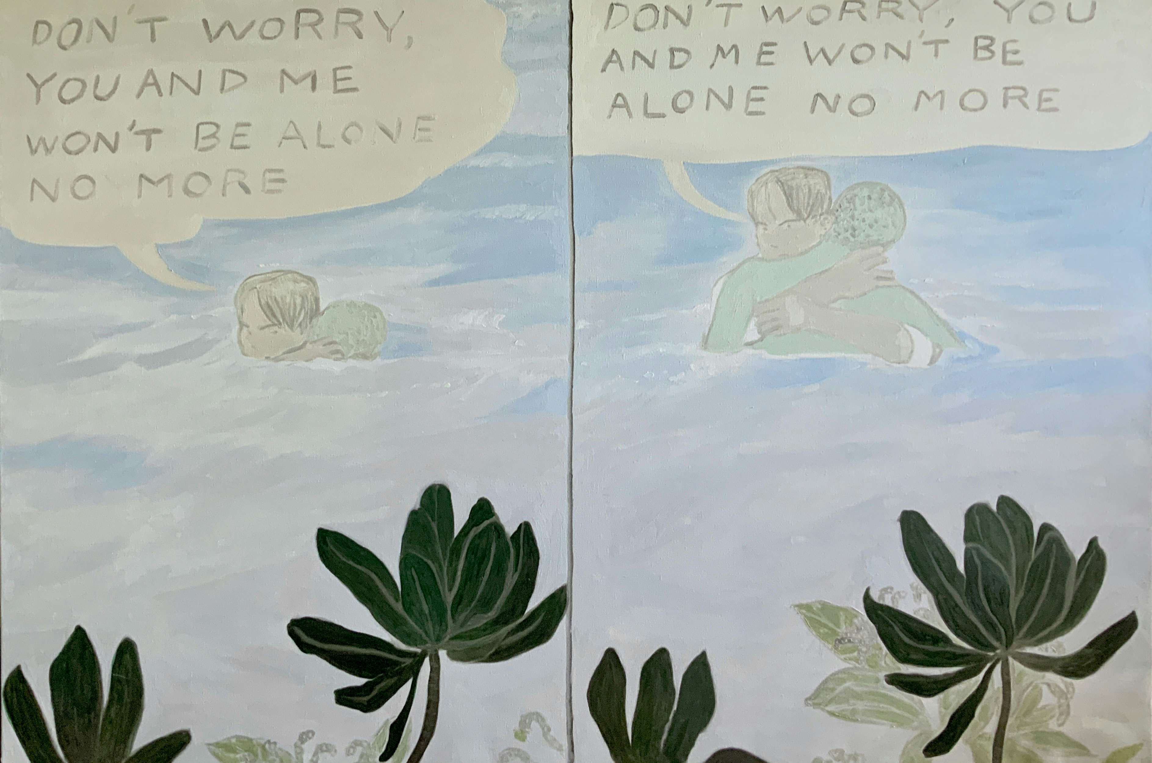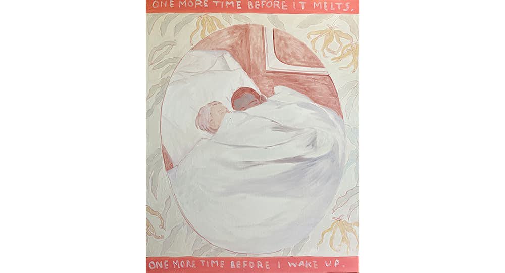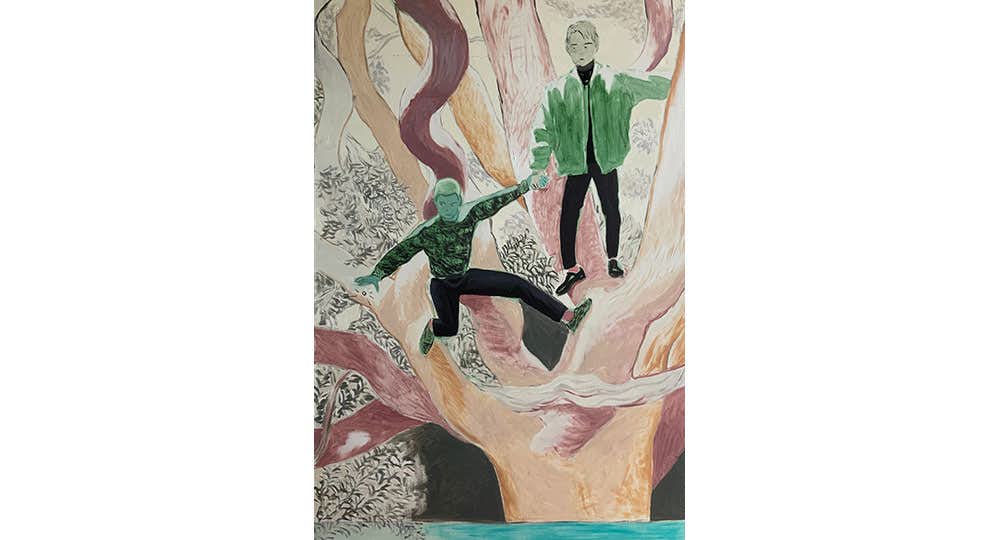 自身が影響を受けてきた古典と、映画やポップミュージックを起点にモチーフを描く左刀。無音のはずの絵画から台詞が聞こえてくるような作品からは、自身がリラックスし、「見る人にも肩肘をはらず、自分らしく幸せに生きることができるようになってほしい」という作家の願いが伝わってくる。