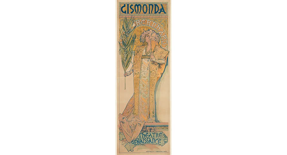1895年、アルフォンス・ミュシャが初めて制作したポスター《ジスモンダ》は、たちまちパリで話題になった。等身大に描かれたサラ・ベルナールはまるで舞台から抜け出してきたようなポスターは、一見すると装飾的に見えるモチーフや文字の配置に、人の視線を意識した細やかな意図も感じさせる。のちにこの手法は「ミュシャ・スタイル」と呼ばれ、いまも人々を魅了している。