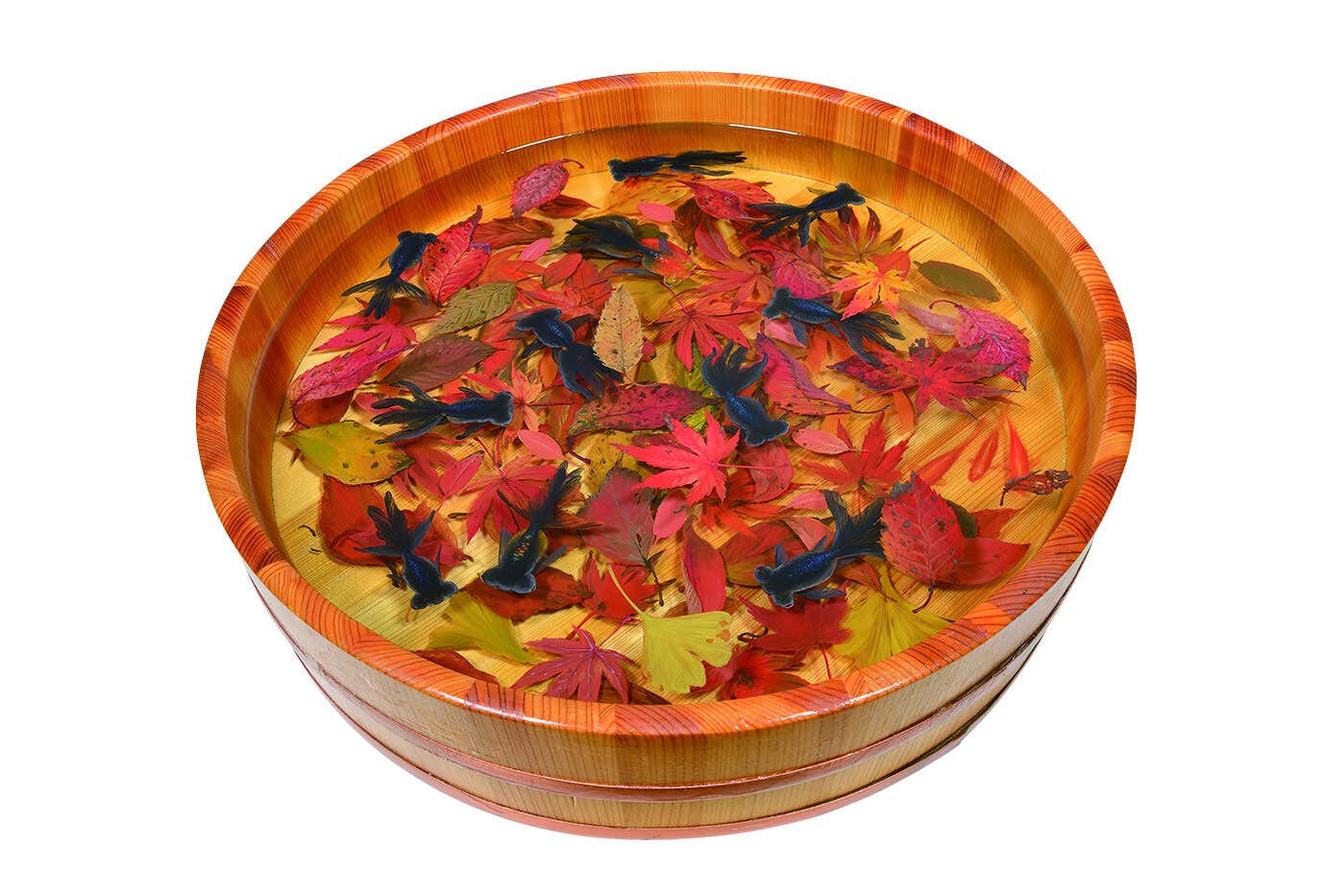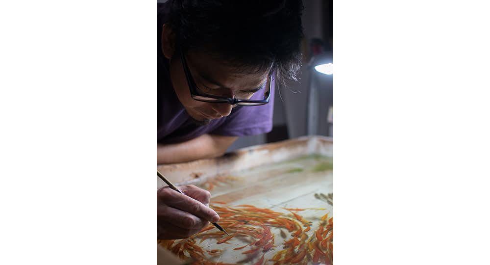 極めて独創的な深堀の技法は、器の中に樹脂を流し込み、固まった表面にアクリル絵具で金魚を少しずつ部分的に描いていき、さらにその上から樹脂を重ねるというもの。この作業を繰り返すことにより、絵が重なり合い、まるで生きているかのような金魚が表現され、圧倒的な立体感をもって見る者に迫る。