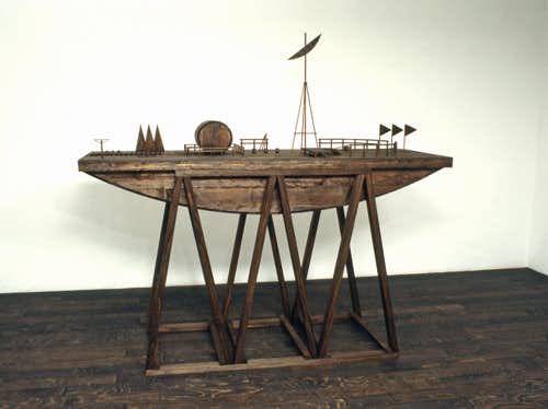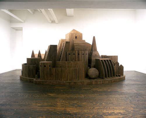 神山は東京芸術大学大学院を修了後、杉の木材にオイルステインを施した三日月や星の形、小屋や塔、階段などを組み合わせた風景彫刻を思わせる作品を制作。建築のように小屋の内部も精緻に作り込まれた作品は、人間の気配を感じさせ、懐かしさを思い起こさせる。