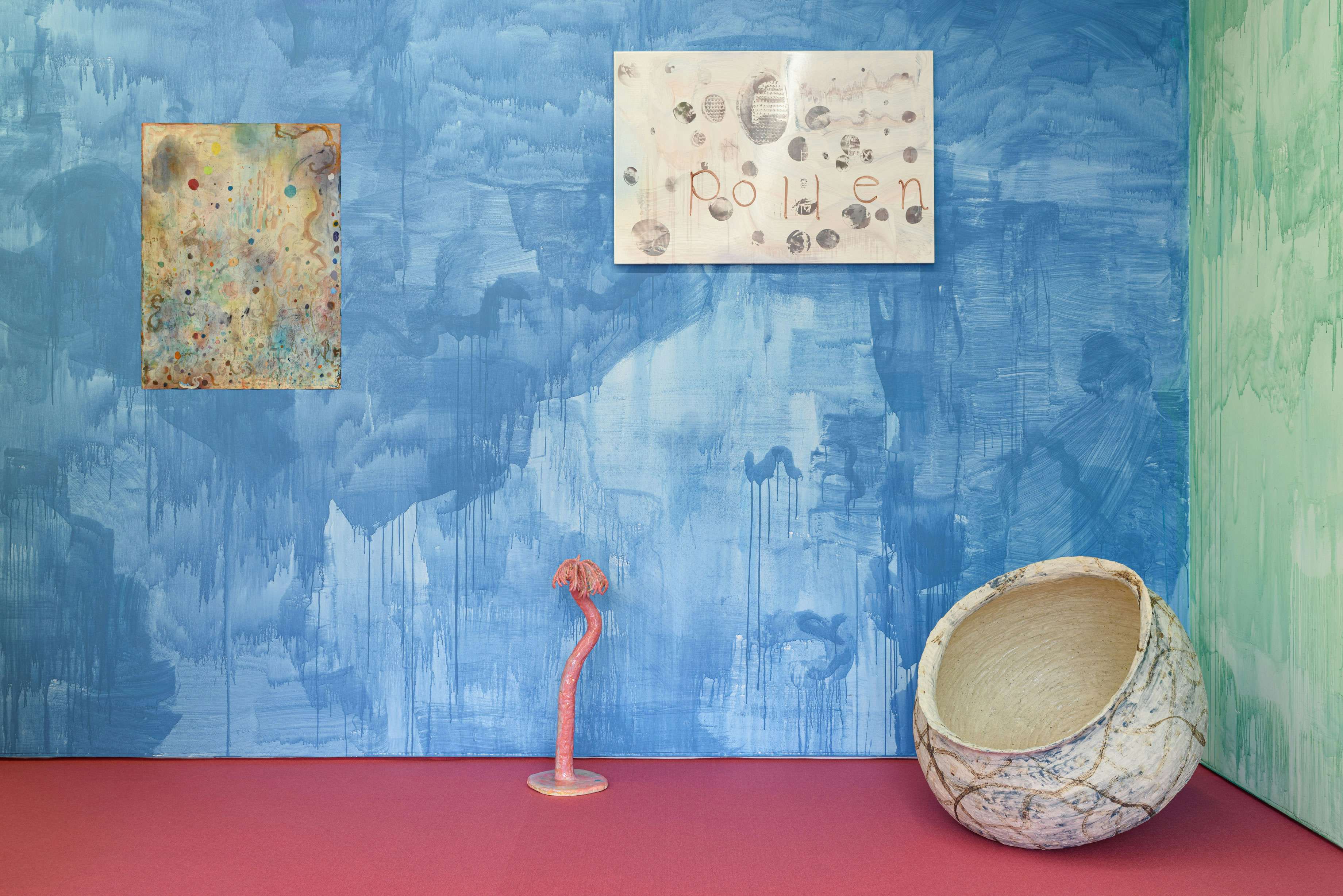 出⾃もこれまでの歩みも異なる2⼈が、互いの活動や作品に興味を持ち純粋に惹かれあって開催される本展。かつてゴッホがゴーギャンを「⻩⾊い家」に招いたように、梅津が2⼈の作品のために手がけた神秘的な空間に誘う。
