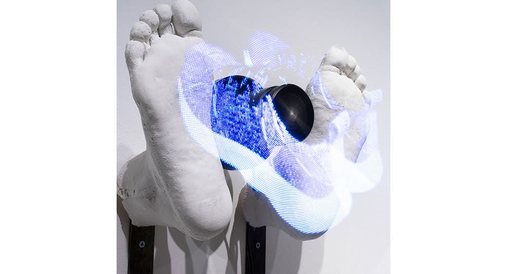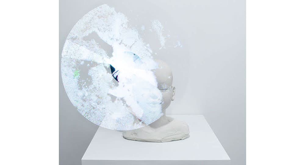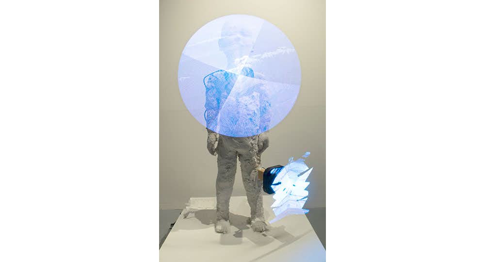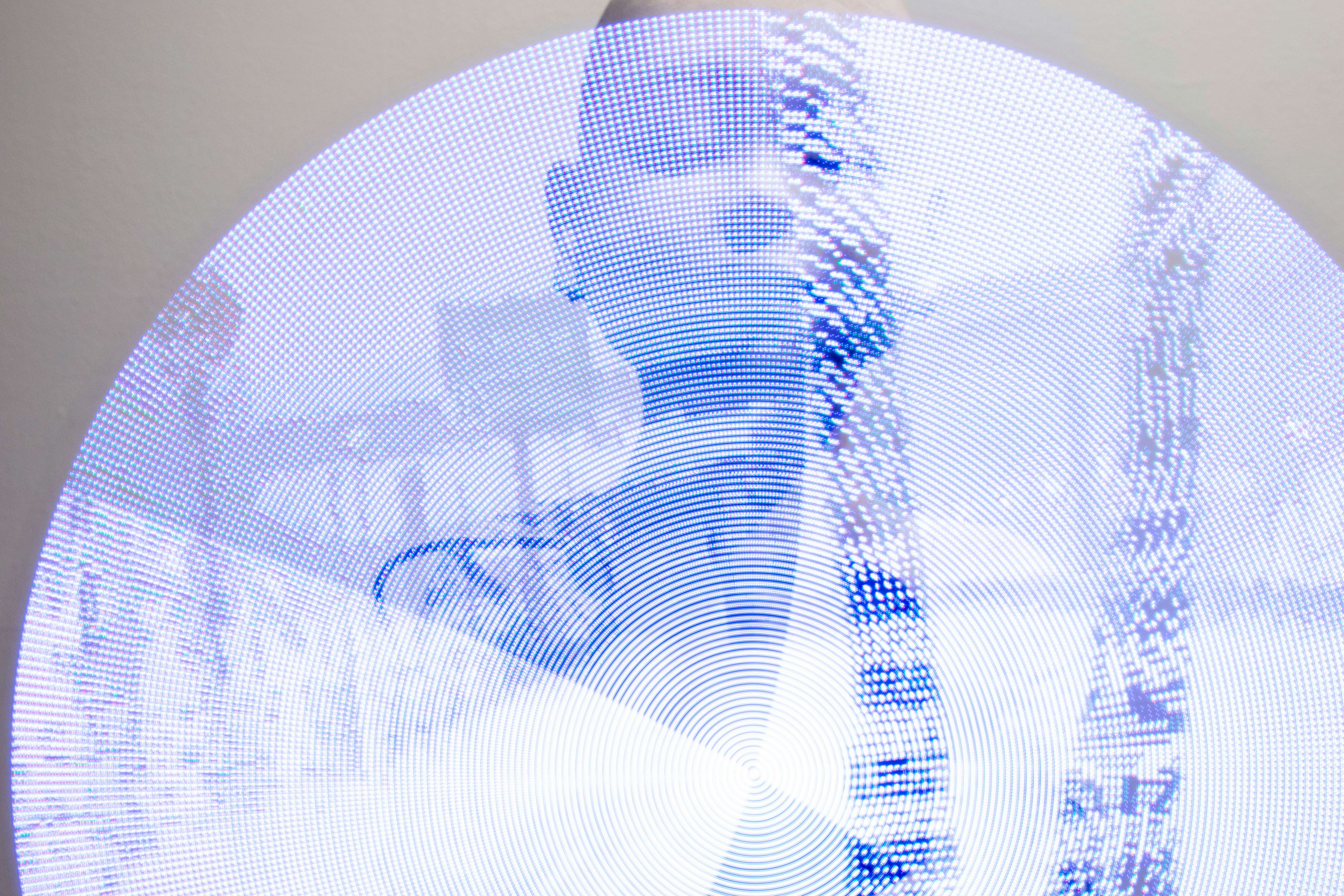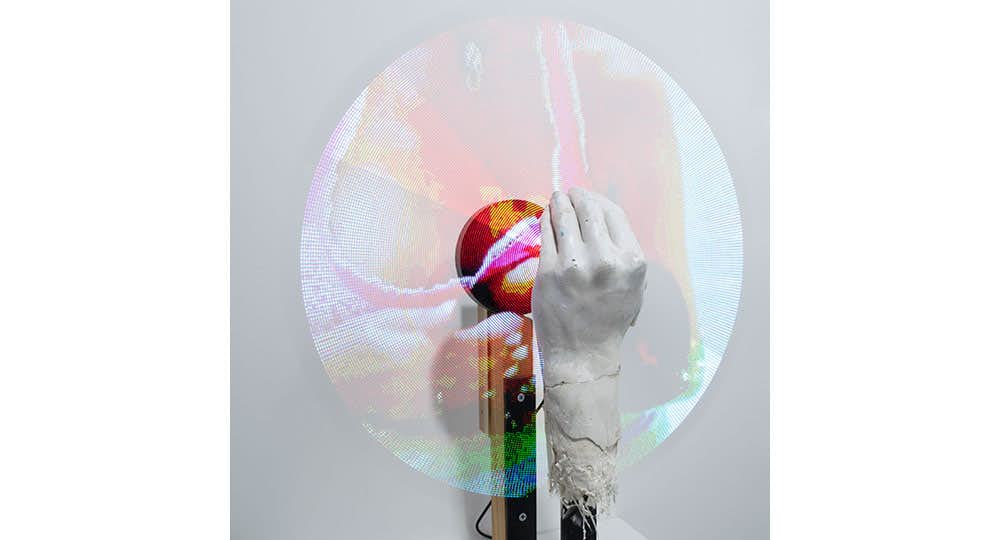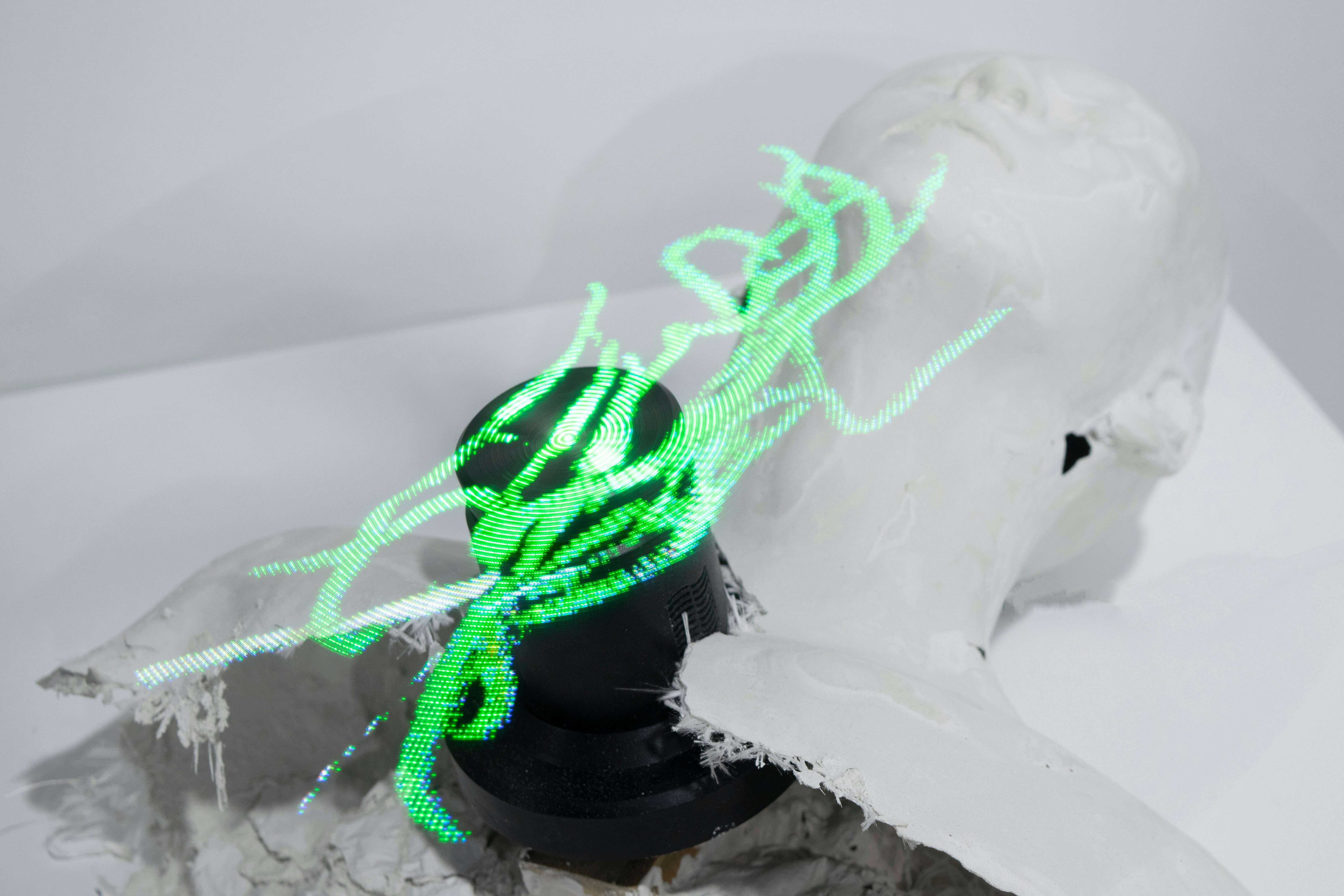 本展で展示される「硬化剤の夢 浮動するサイネージ」は、人体彫刻に接合された高速回転するLEDブレードによって映像が浮かび上がり、様々な鑑賞体験をもたらす。