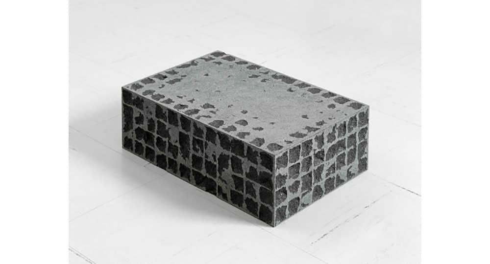本展では、1メートル四方の大作を中心に数点を発表。「黒体」「再封」シリーズと続く、表面を基盤の目のように細かく削る仕事から、さらにその凹凸をなくした「ハスバタケ」の様相は、枯れたハスと石の内外への作家の関心がイメージとともにつながっていくようだ。