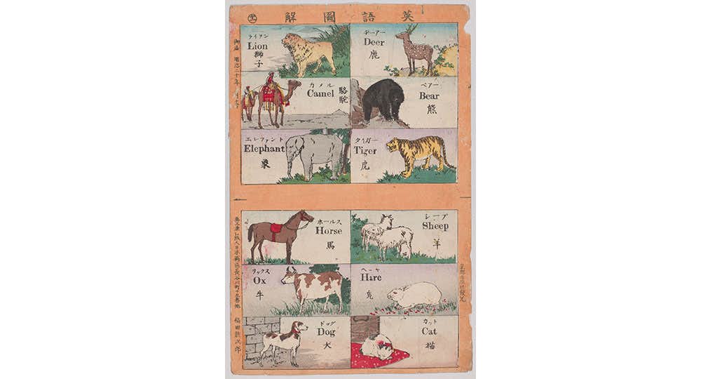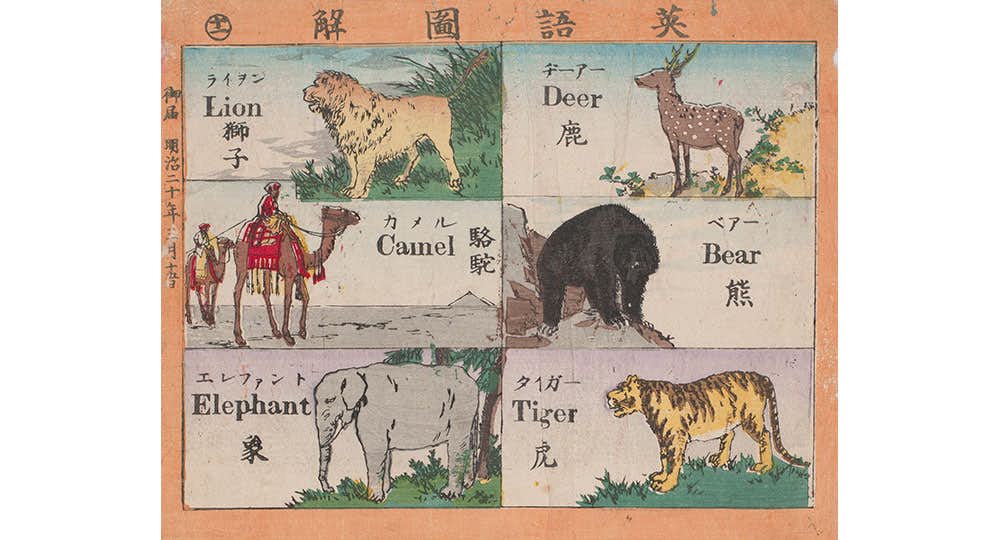 主な出品作は、歌人を十二支の動物たちに擬人化した「十二支歌仙歌合色紙帖」(江戸時代)や歌川広重(三代)筆による「英語図解11」(明治20)、土方巽「舞踏譜スクリプトシート」(1970〜86)など。地域や時代、領域を越えた、様々な作品の間を行き来しながら、思わぬ「虎」に出会う空間を用意している。