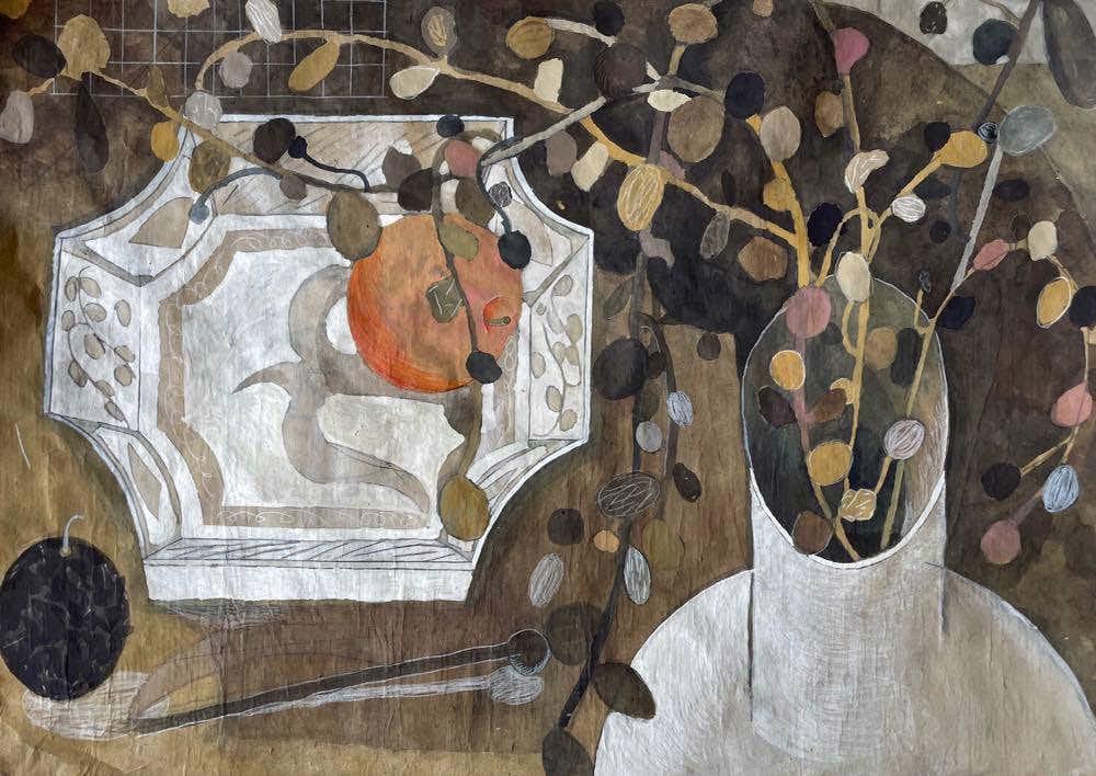 村松の作品には、静物としての道具や器、料理、植物など身の周りの至って日常的な風景が描かれてきたが、コロナ禍以降、その傾向はより色濃く現れている。「自身の周りを描くことは、きちんと暮らしを送り足元を固めていく感覚がある」と作家は話す。2020年に行われた個展では、祖母が住む山梨の土や石を砕いて絵具をつくり、手漉き和紙の産地である生まれ故郷の山梨県市川三郷町の紙を用いて完成させた作品を展示した。
