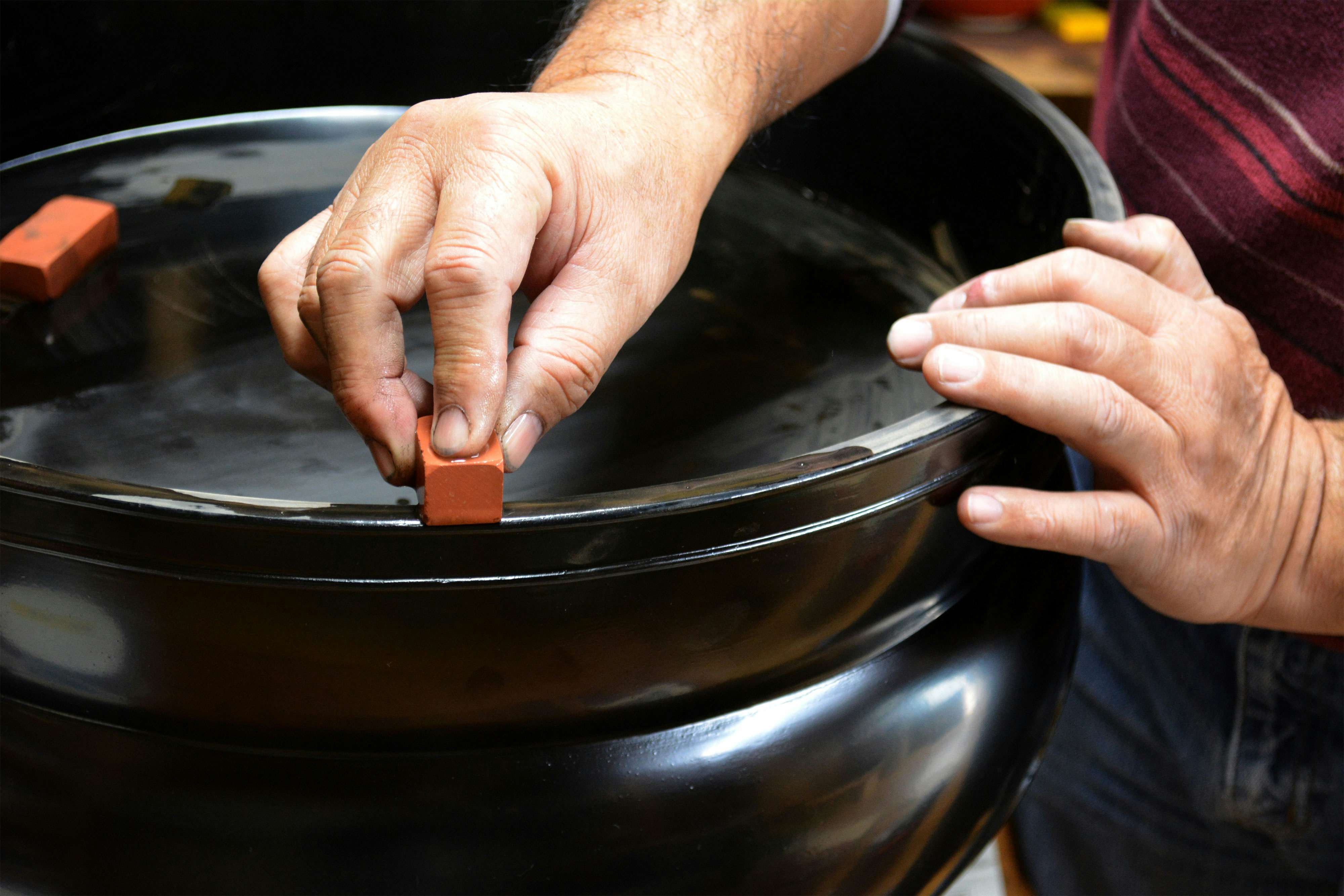 「手わざ」とは、作品を製作する手仕事の高度な技術を意味するもの。沖縄県立博物館・美術館が2015(平成27)年より行ってきた「琉球王国文化遺産集積・再興事業」では、明治以降の近代化や先の戦争で失われた文化財とその製作技術の復元に努めてきた。この事業で完成した作品は、絵画、木彫、石彫、漆芸、染織、陶芸、金工、三線に至る8分野と多岐にわたり、携わった専門家、技術者は県内外100人以上にものぼる。