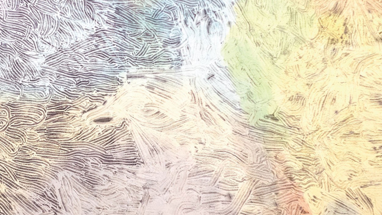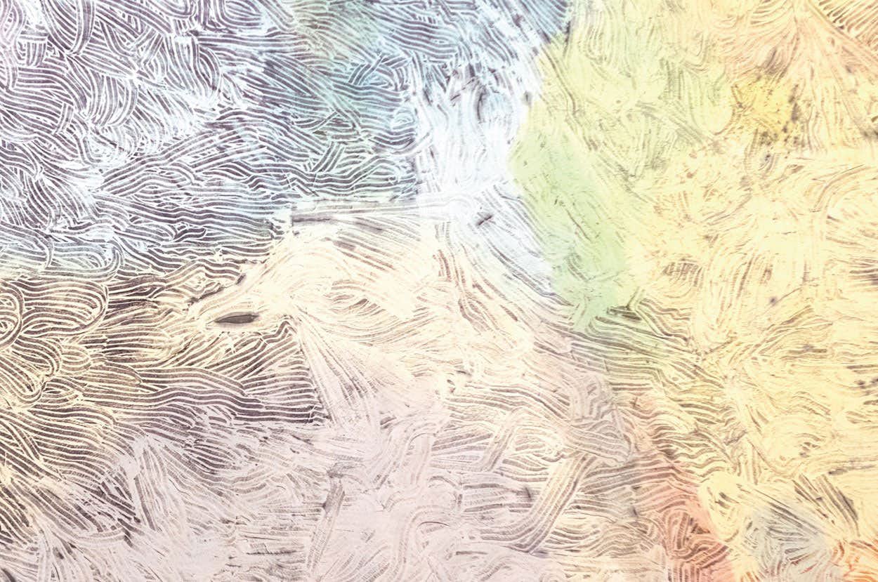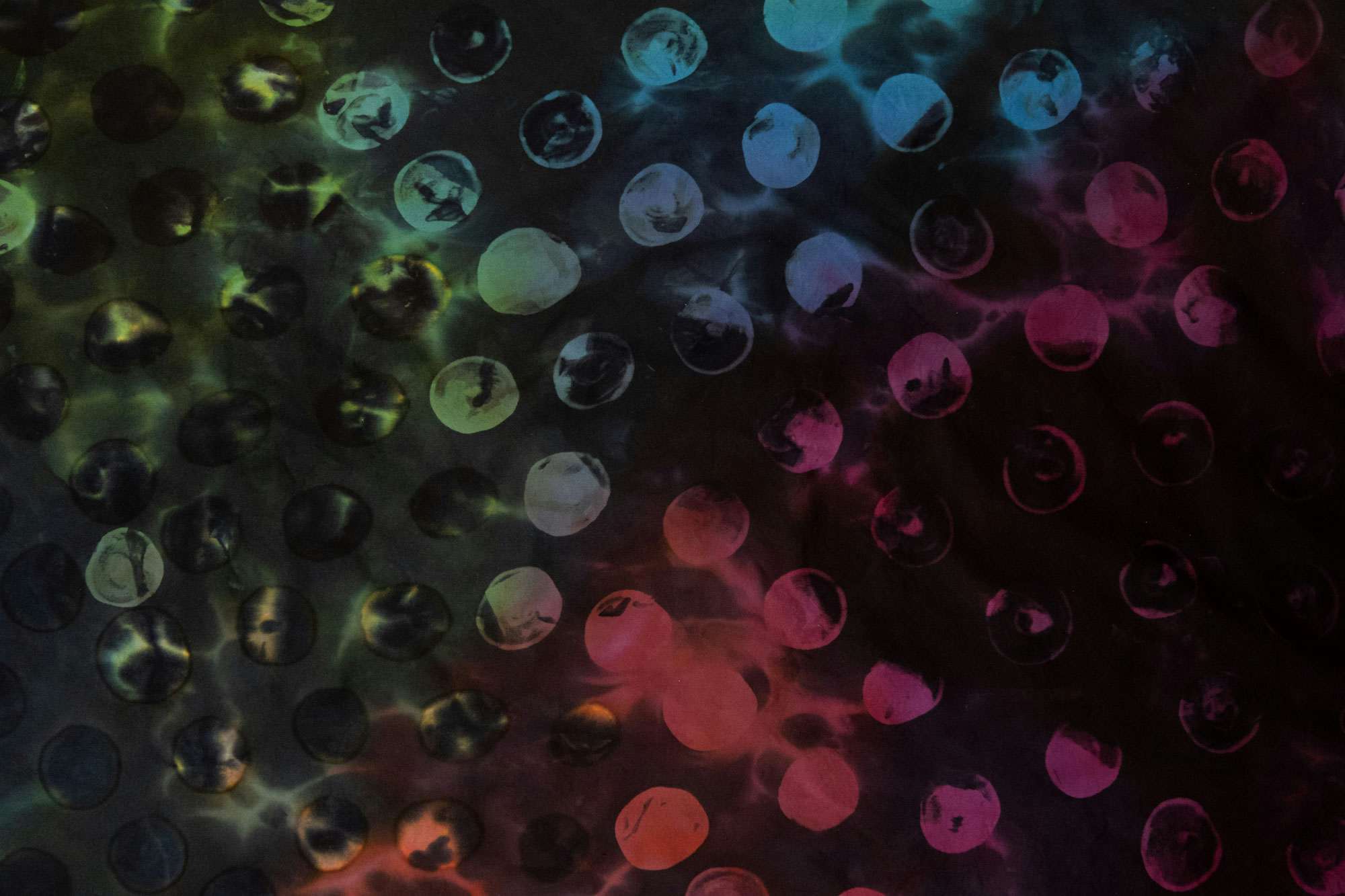 作家としての自らの姿勢を後進に示そうとするなかで、感覚的な制作手法を抑え、論理的にそれを選択する意識が高まったと加賀城は言う。加賀城がいま強く関心を寄せているのは、以前より自身の制作テーマのひとつであった「他力」と呼ばれる領域を、より積極的に作品に取り込むこと。加賀城の作品を構成する主な素材である布や染料としての水、糊などの性質を、実験と観察を幾度と重ねて理解することは以前より大切にしていたが、作品制作において自身が取り組む領域と、自然の現象に委ねる領域を、いかに理知的に定めていくかに思考を向けている。また、近年の作品は染色技法のレイヤーが複雑化し、表層的には制作のプロセスがとらえにくい視覚構成になっており、加賀城の積極的な手技による経験の再構築と研究意欲が随所に垣間見られる。
