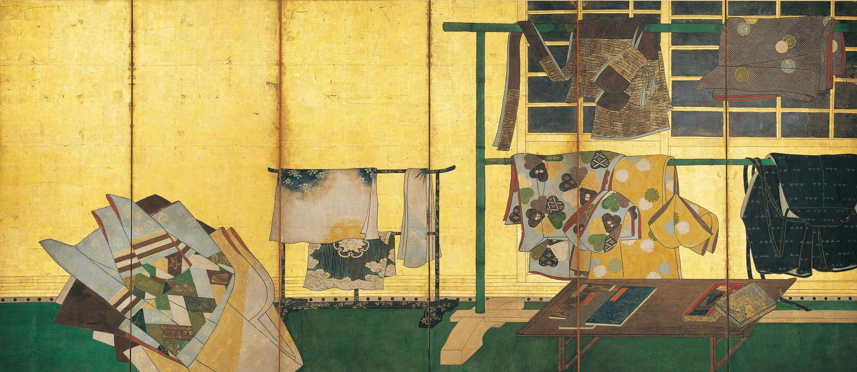 本展は、文様と技法それぞれの立場から両者の関係に迫ろうとするもの。第1章では「文様から技法を探る」として、能装束や現在のきものの原形である小袖をもとに、文様と技法の聞にどのような関係が見いだせるのかを探ると同時に、当時の服飾の流行を反映した「誰(た)が袖図(そでず)扉風」を、描かれたきものの文様と技法の観点から読み解く。