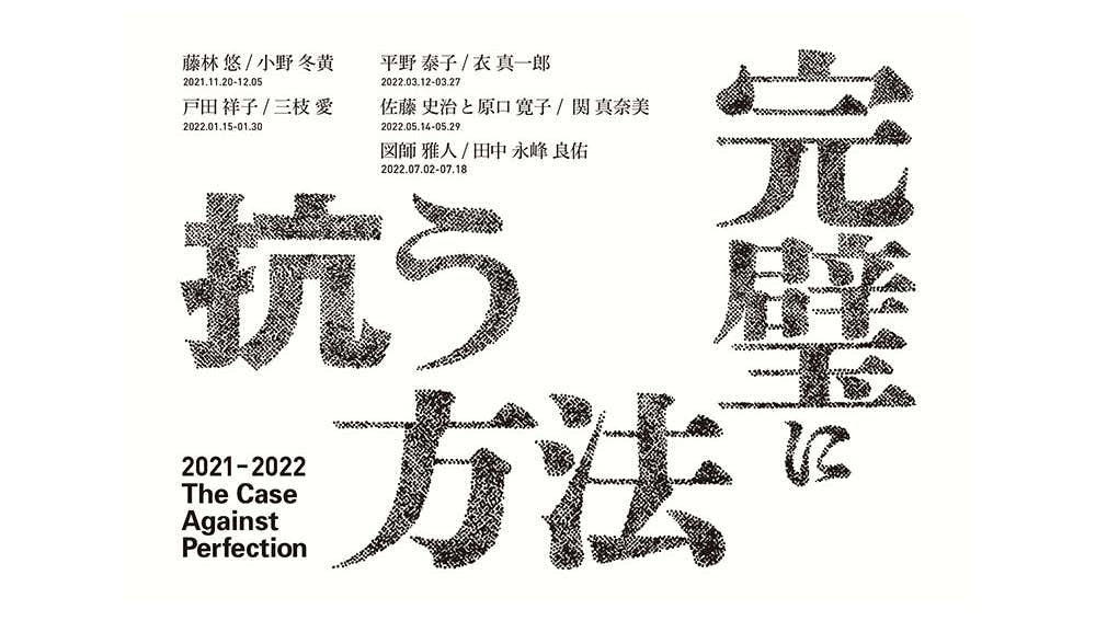 「完璧に抗う⽅法 – the case against perfection -」は、図師雅⼈と藤林悠による企画展覧会。企画者を含む9名と1組のアーティストが、2⼈展を隔⽉で開催する。出展作家は藤林悠、⼩野冬⻩(会期終了)、⼾⽥祥⼦、三枝愛、平野泰⼦、⾐真⼀郎、佐藤史治と原⼝寛⼦、関真奈美、図師雅⼈、⽥中永峰良佑。2021年の初回に続き、第2回「波を掴み、地と歩む手立て」には、戸田祥子と三枝愛の2人が参加する。