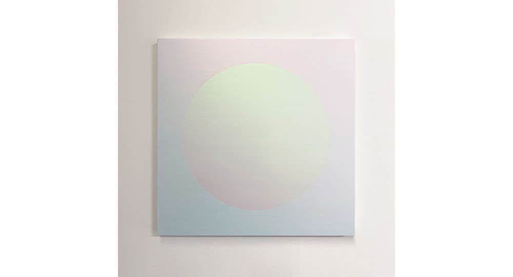 本展では、「Interference」シリーズの新作を発表。2019年の個展では主に長方形のキャンバスにひとまわり小さい長方形を描いたのに対し、新作では、正方形のキャンバスのなかに円を描いた。キャンバスが光を受けることで、色が豊かな表情を見せ、作品を観る角度や、時間帯によって様々に立ち現れる色彩の変化は、SNSなどネットでモニターを介して作品を見ることが増えている現代において、画像ではとらえきれない視覚体験をもたらす。