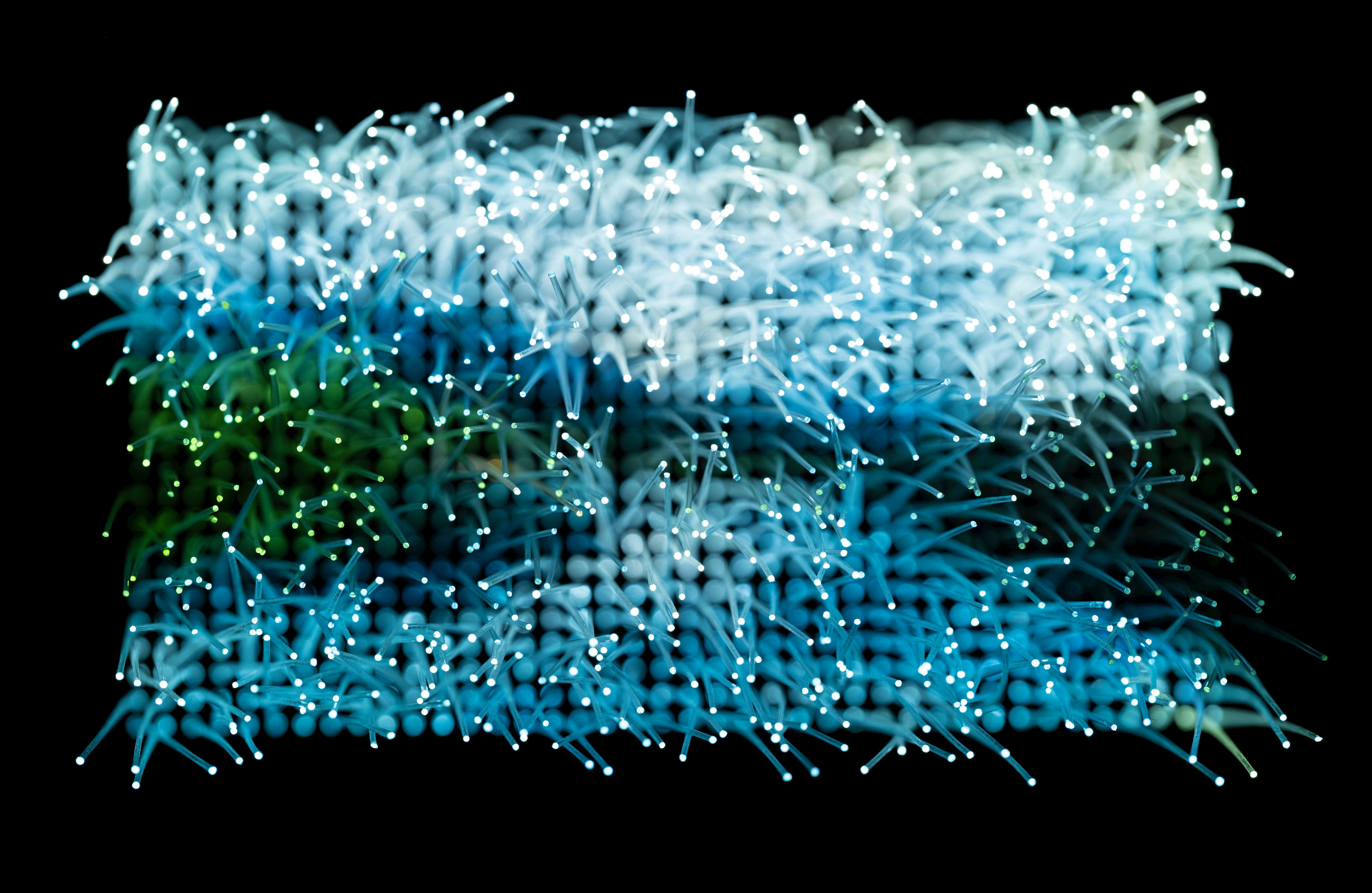 本展は「光解体」と題し、光ファイバーを用いたインスタレーションと、それをもとに撮影した写真作品で構成される。