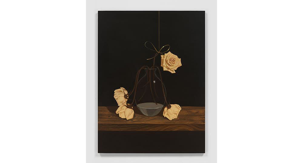 本展に登場する5点の紙作品および4点の絵画作品のなかには、「キラキラしたパーティのひどいありさま」といったストーリーが語られている。そのダークでファンタジー的な世界観のなかで、画中の主題を統制しながらも嘲笑うようにくるくると浮遊する金リボンや、可憐な花がしおれた姿が描かれているいっぽうで、《Girl Crying at a Party》(2021)はその光景を見渡すような視点をもって描かれている。