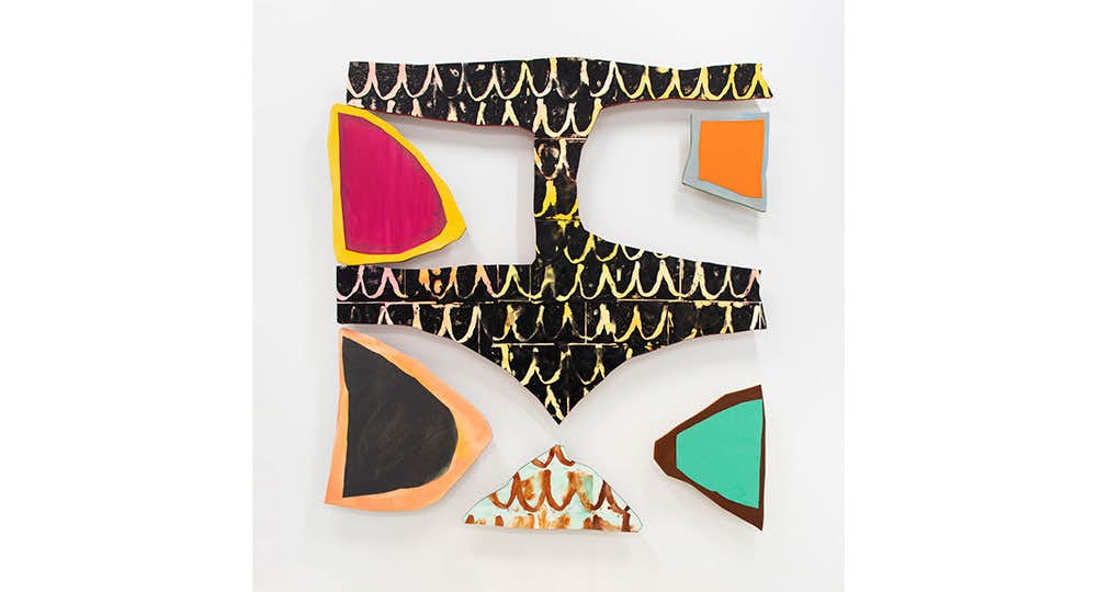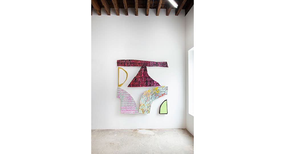 ヒルは、私たちが慣れ親しんでいる伝統的な長方形の絵画と並行して、「Cutout(切り取り、切り抜き)」と自身が呼ぶユニークな形状のキャンバスをいくつも組み合わせた作品も制作。長方形キャンバスの制約を超えて発展する構図を追求した不定形キャンバスの組み合わせは、鮮やかな色合いのジェスチャーマークで装飾されており、その多くは作品全体にリズム感を与える反復したパターンを特徴のひとつとしている。これらのペインティングをつくり上げる自由なかたちたちはランダムで衝動的に見えるかもしれないが、実際には数ヶ月、時には数年の準備や研究によって生まれている。