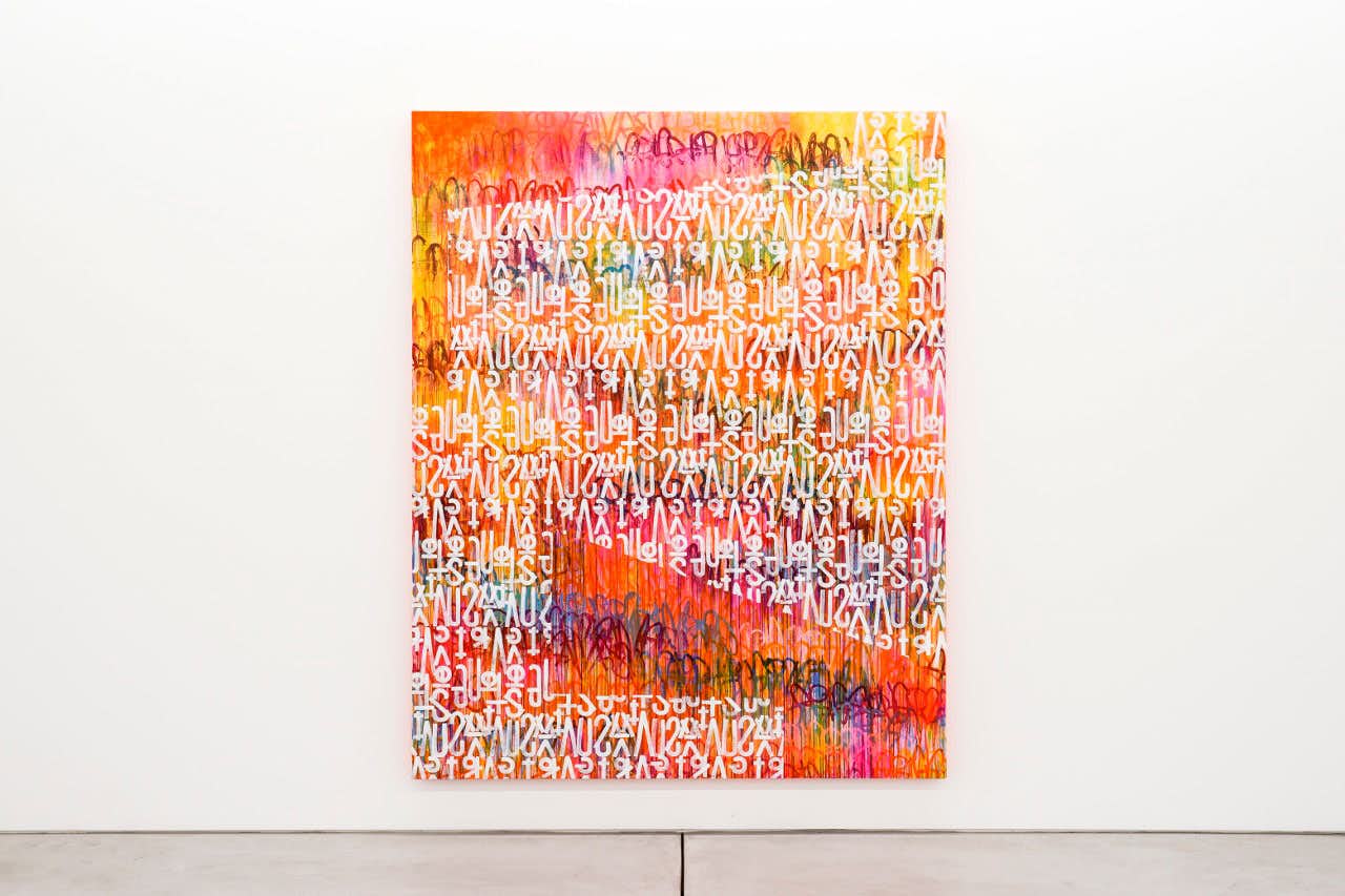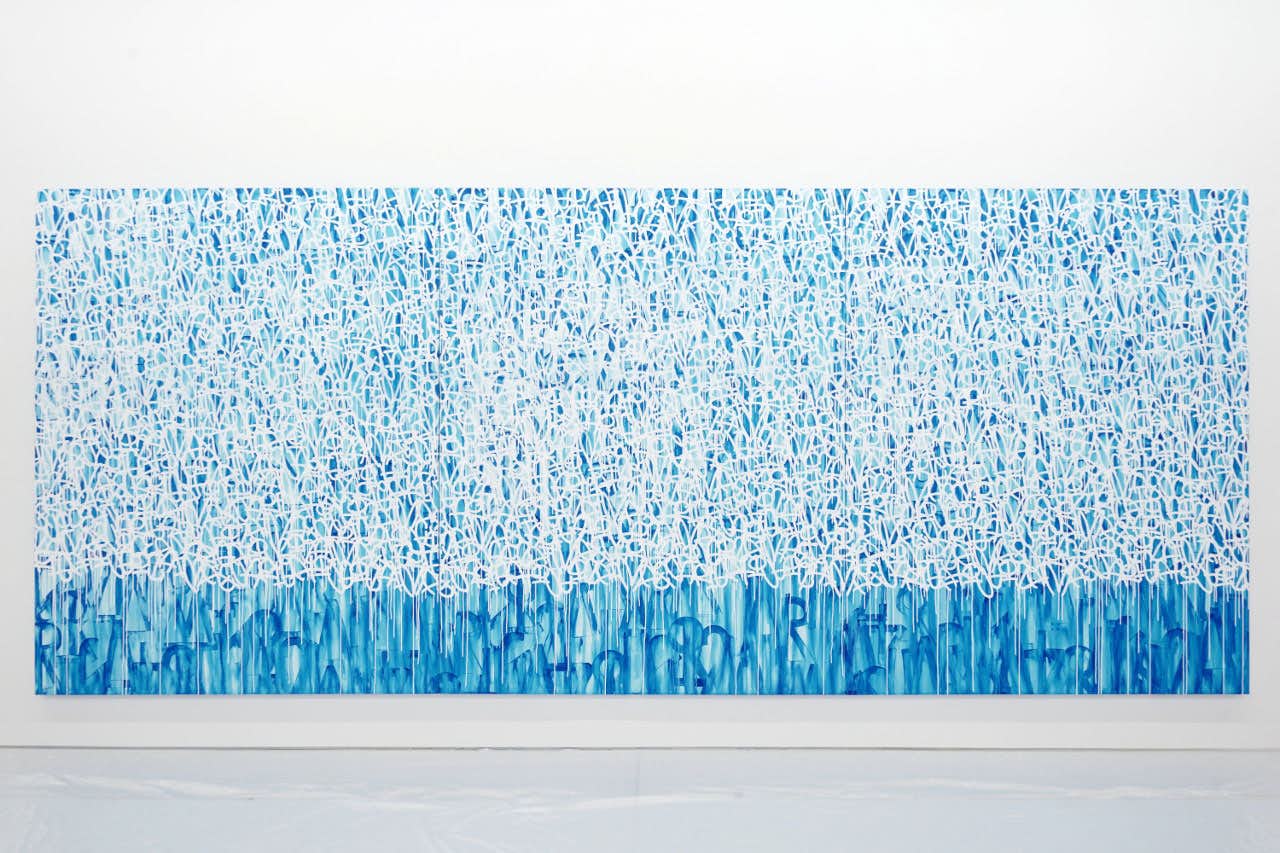 一見華やかにみえる活躍の裏側で、baanaiはひたむきに自身のアートを追求してきた。17年からは、キャンバスに「ARIGATOUGOZAIMASU」の言葉を繰り返し描くことを軸に芸術実践を続けている。執拗なまでに反復された文字によって画面全体を埋め尽くすという、作家独自のスタイルによって生み出される作品は、何層にも塗り重ねられ、見る者を奥に奥にと引き込む。