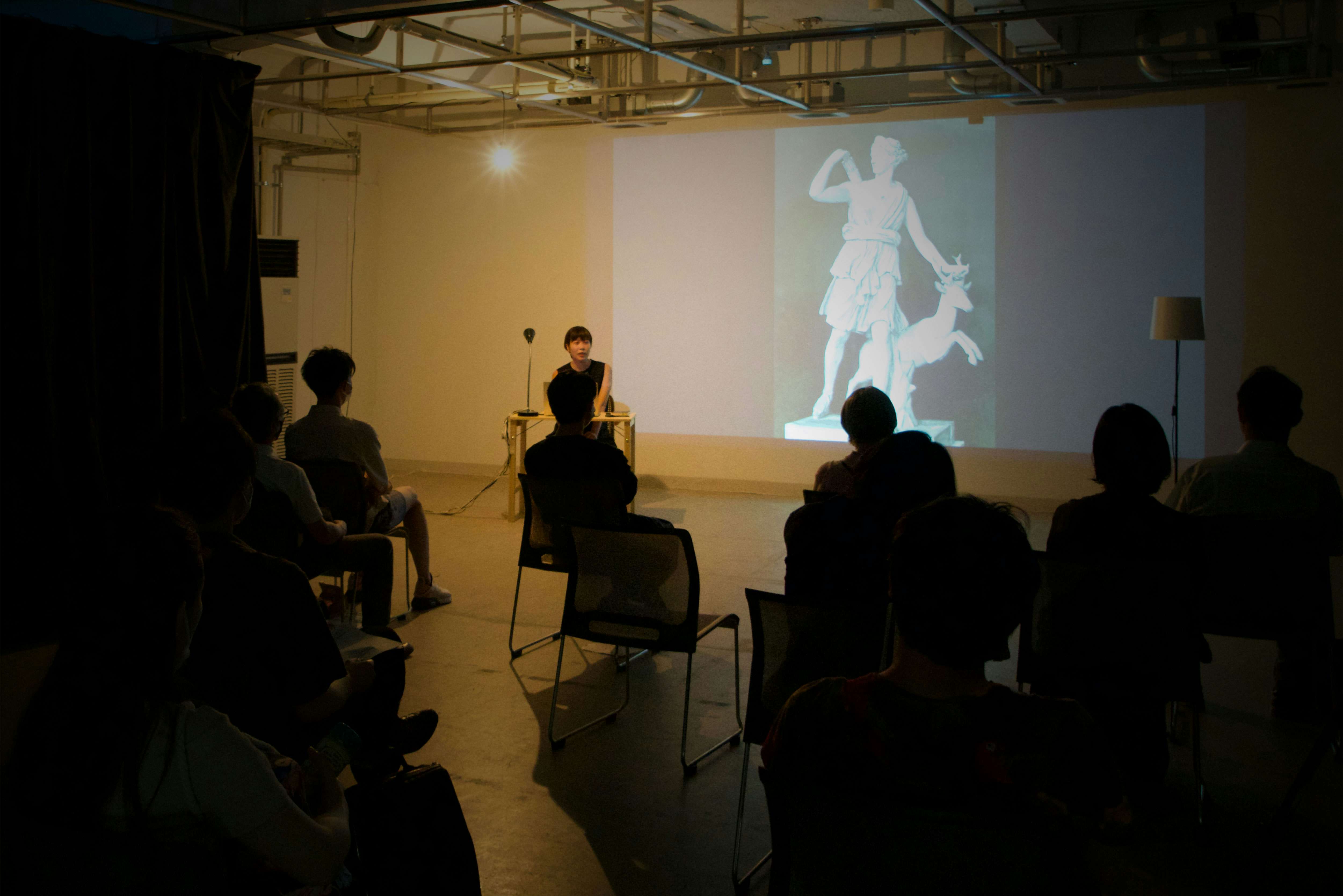 出展者は、内海拓、ジョイス・ラム、孫奎星、田中彩、松井靖果、山岸耕輔、浅尾鷹哉、姜賢植(修士課程修了制作展、15期生8名)、今宮有葉、うしお鶏、桒原幹治、佐藤瞭太郎、下川晴葵、砂川天望、田中くるみ、永田風薫、布谷麻衣(修士一年次成果発表、16期生9名)。