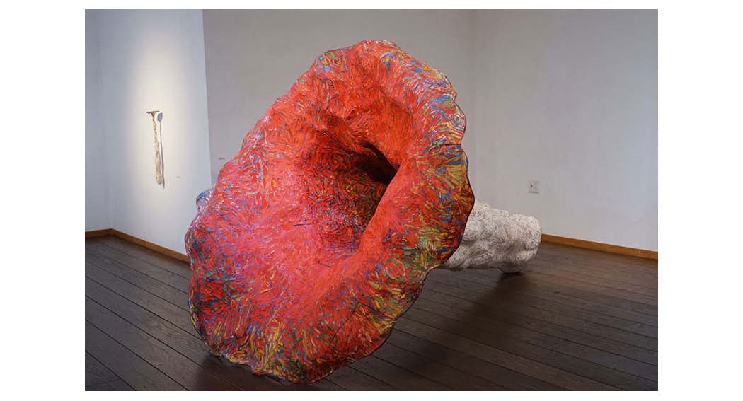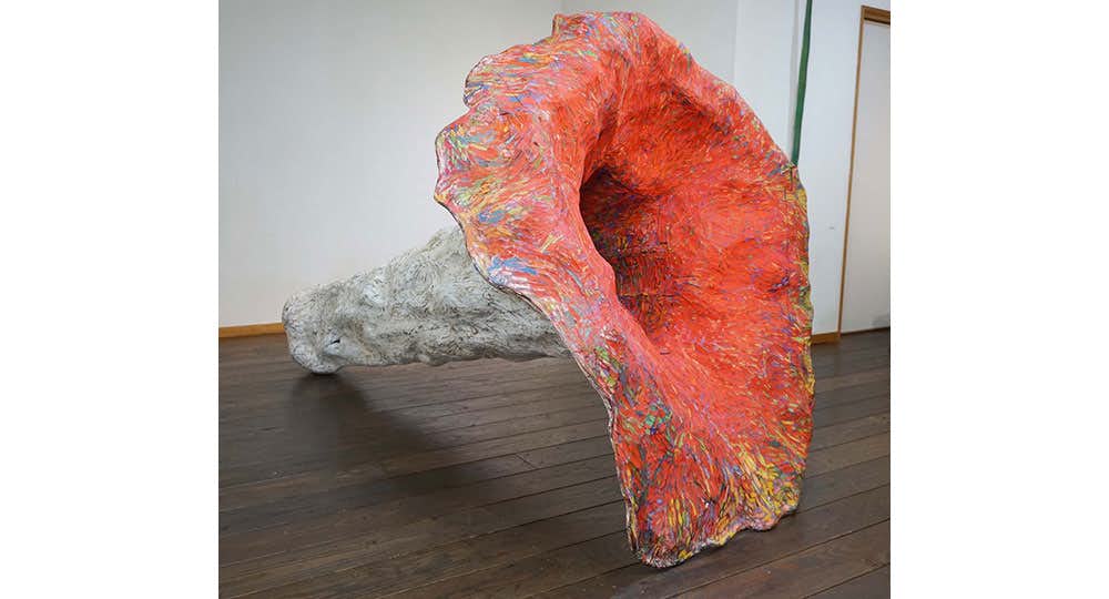 今回メインとなる『絵画の庭―横臥花(オウガカ)』は、横向きに花が広がったような形態をしており、長さは約2,7メートルです。中は空洞であり、内側全面が彩られています。逆に外側は白色に塗られていますが、これは色彩面が絵画を担い、白色の側がその裏側であり、いわばキャンバスの裏側のようなものと考えています。