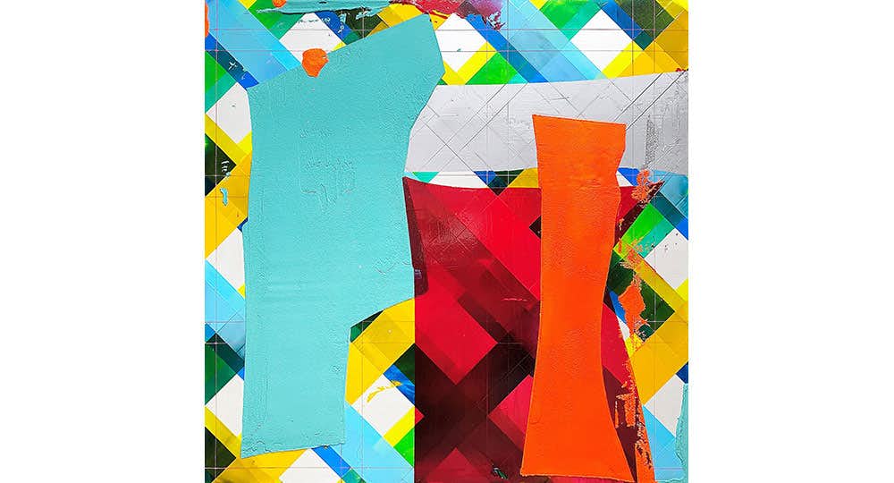 松岡の作品は、色鮮やかでテキスタイルのような柄が特徴。すべて絵具を用いた手書きで制作され、複雑なパターンの上に、大胆に単純な色面を重ねた作品は、それぞれの角度で表情を変え、鑑賞者の視覚を刺激する。
