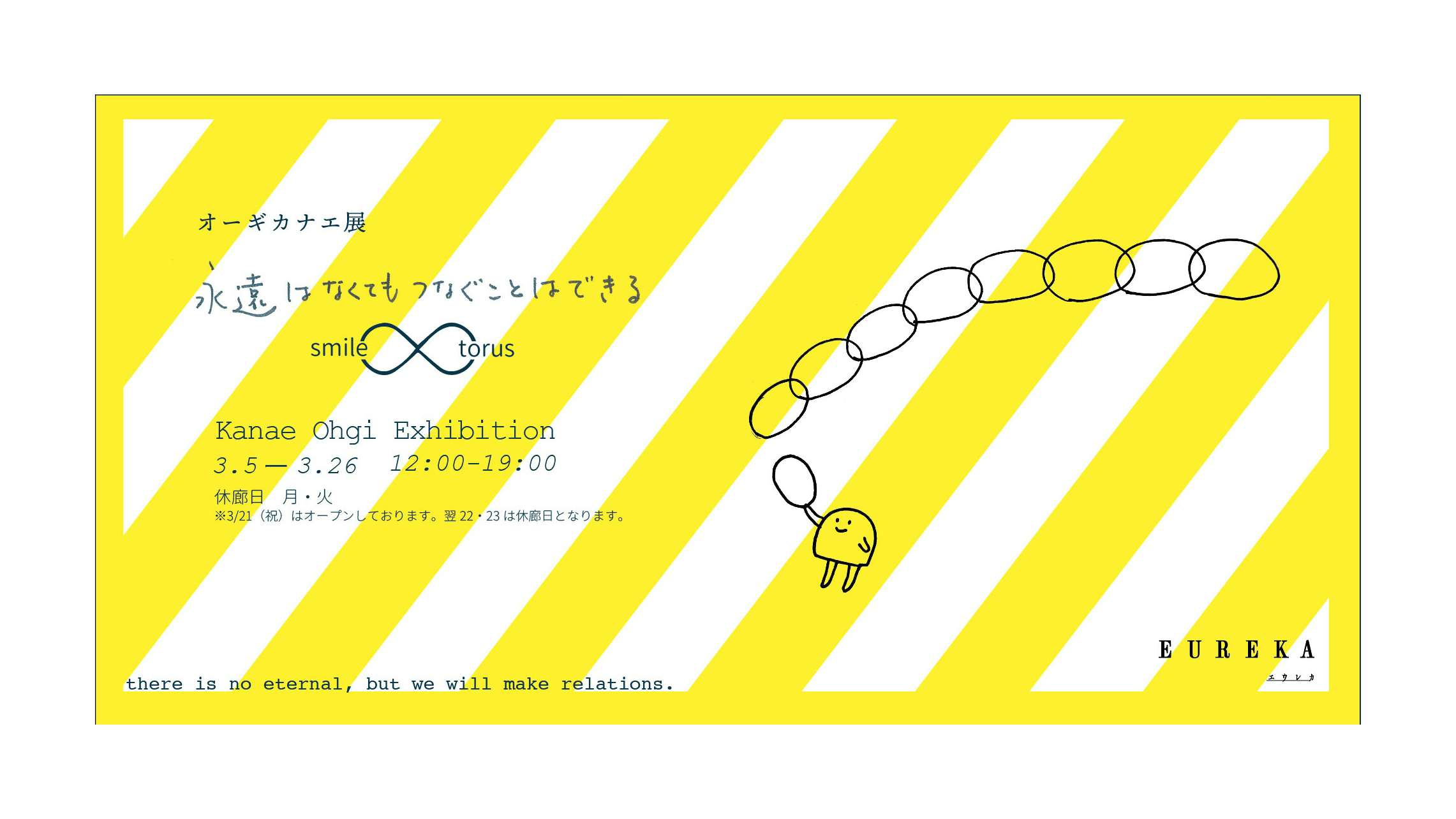 福岡にあるEUREKAでは、久留米市を拠点に活動しているオーギカナエの個展「永遠はなくてもつなぐことはできる smile ∞ torus」を開催する。