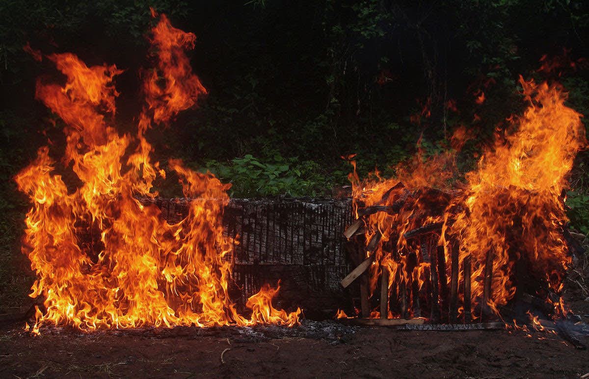 本展では、木や鏡を使用した彫刻と平面作品で構成された、重厚な空間を展開。黒く炭化した柩の形状をした立体、そしてそれに対峙する壁面に掲げられた鉛の「空体」が中心となる。