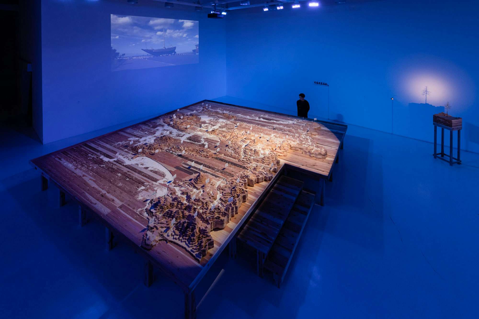 いっぽう、十和田市に拠点を持ち、県内を長年フィールドワークしてきた山本修路は、青森全土を青森県産の杉材で制作した6.2×6.5メートルの巨大なジオラマ作品《青森県立体地形模型》を展示。県内の様々な場所で撮影した写真も映し、青森全土を体感できる作品を展開する。
