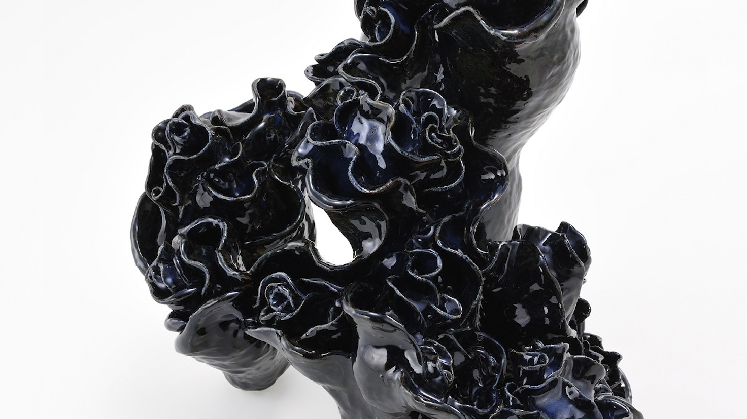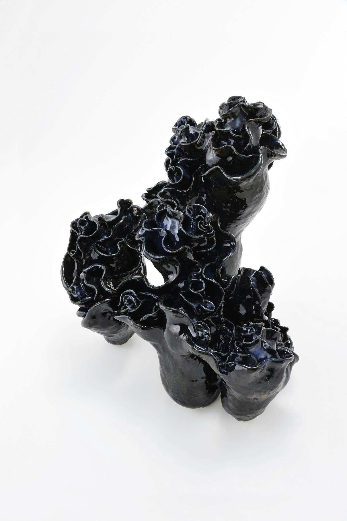 ひだのような多層的な形状と湿った粘膜を思わせる釉薬が、湿地帯に生息する生物を連想させる森の作品。本展では正面性を重視した過去作品から一転、どの角度からも楽しめることを重視した作品を展示する。