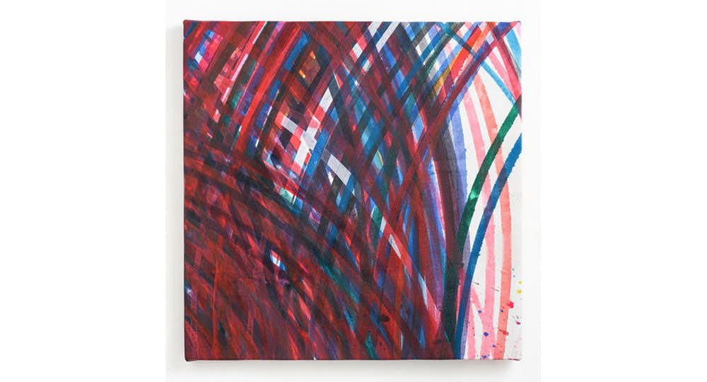 國久は「弧の線」を重ねることで「光」を表現しているという。フリーハンドで平⾯の上に描き出される線は円弧となるが、作家⾃⾝の視点からすればそれは⾃らの体に対し真っ直ぐに存在している線でもある。本来⽬に⾒えないはずの線が、そのときの⼼情や、季節、環境、気温といった外的要因に応じて選択された⾊彩でキャンバスの上に描かれている。
