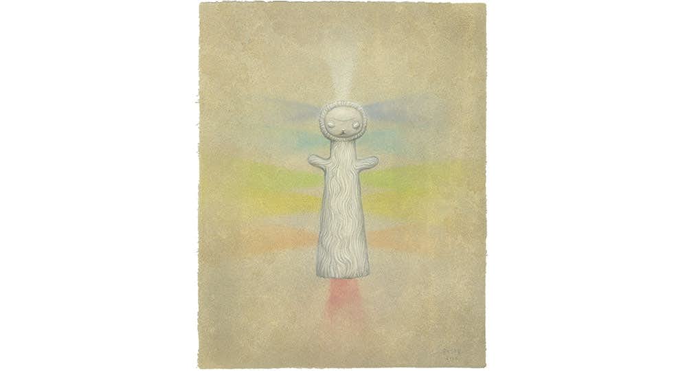 神秘的な動物の彫刻「ヤカリーナ」の体は、細長い円すい形をしており、顔を除く全身は毛皮で覆われ、愛らしくも不気味な姿をしている。ライデンはたびたび扱う題材「Anima Animals (アニマ・アニマルズ)」と、青銅時代から永続し、様々な古典的宗教美術に繰り返し登場する図像を結びつけ、自身の芸術的表現を通して再考している。